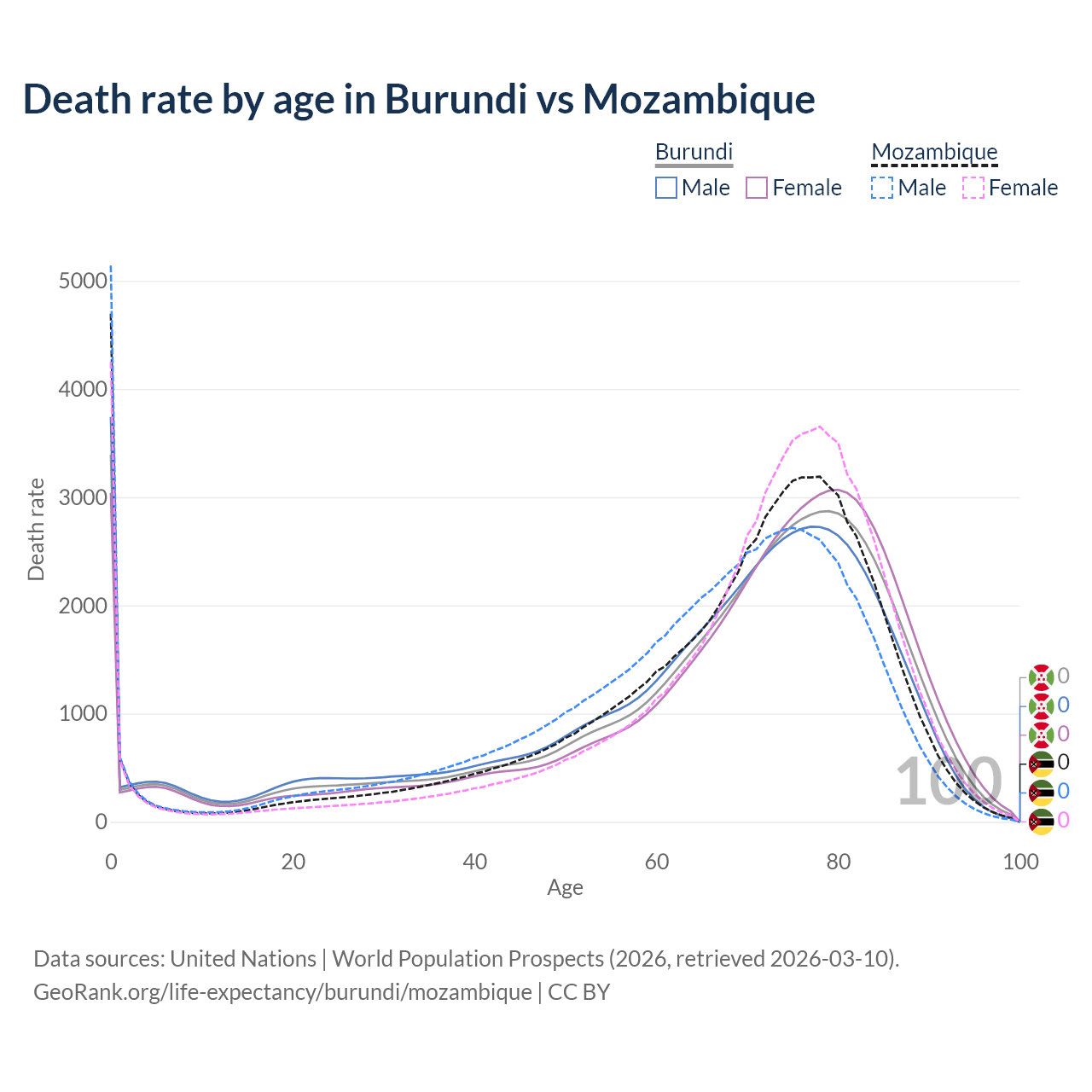In Burundi, the most common age of death is 0, compared to 0 in Mozambique. The median age of death is 71.6 in Burundi and 71.2 in Mozambique, meaning only half of each cohort is expected to live past that age.