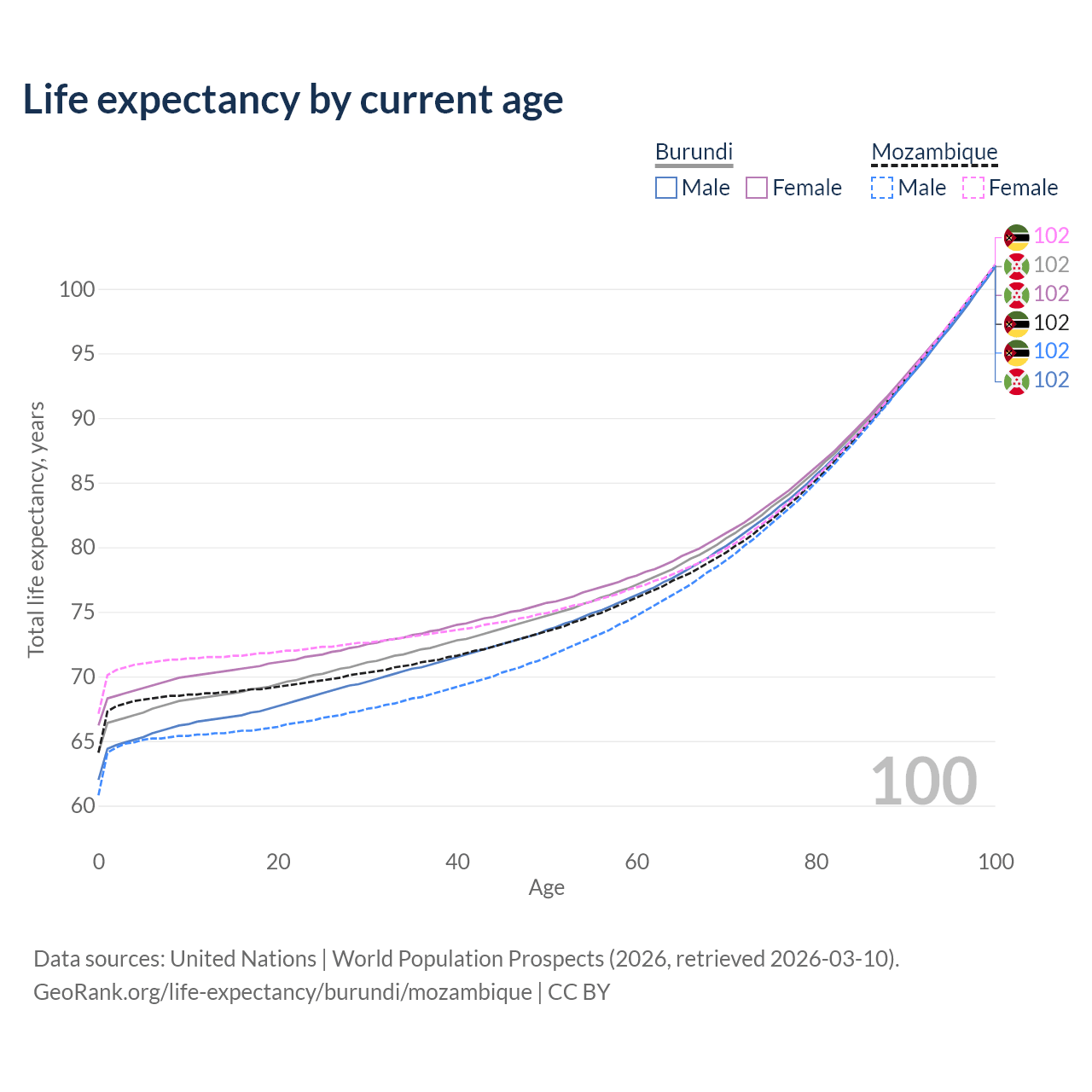This life expectancy calculator shows the odds of living to 100, 95, 90, and below based on current age for both males and females in Burundi and Mozambique, along with mean and median age of death. The calculations are based on the 2026 life tables (actuarial tables) from the UN World Population Prospects.