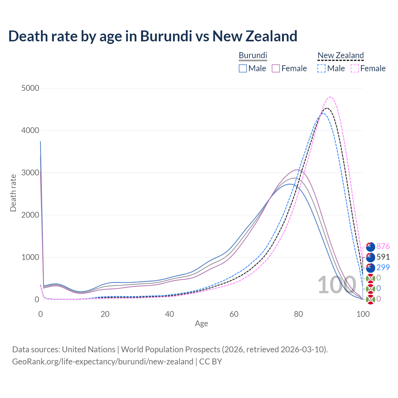 In Burundi, the most common age of death is 0, compared to 89 in New Zealand. The median age of death is 71.6 in Burundi and 85.8 in New Zealand, meaning only half of each cohort is expected to live past that age.
