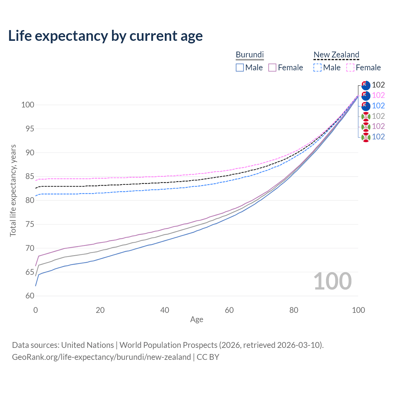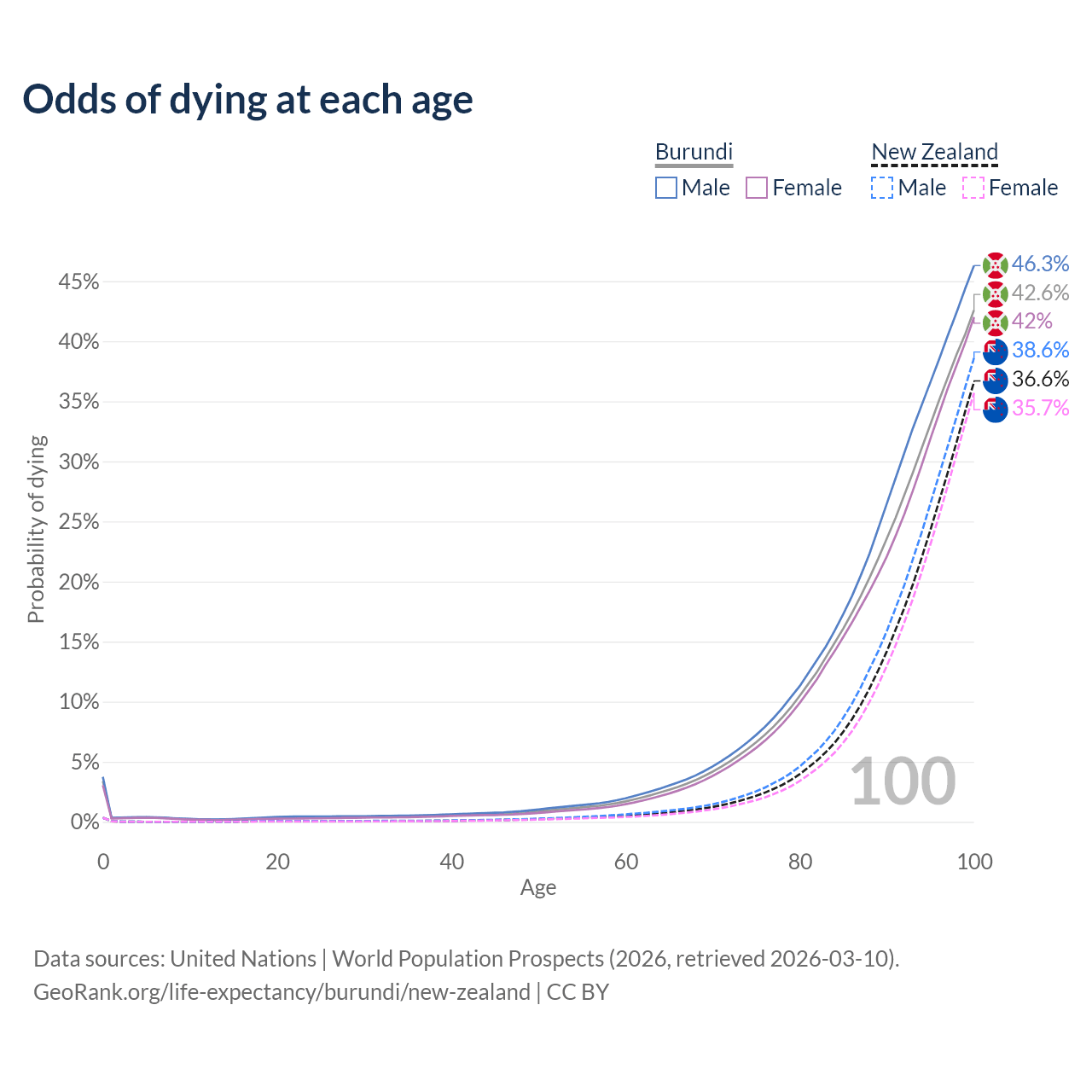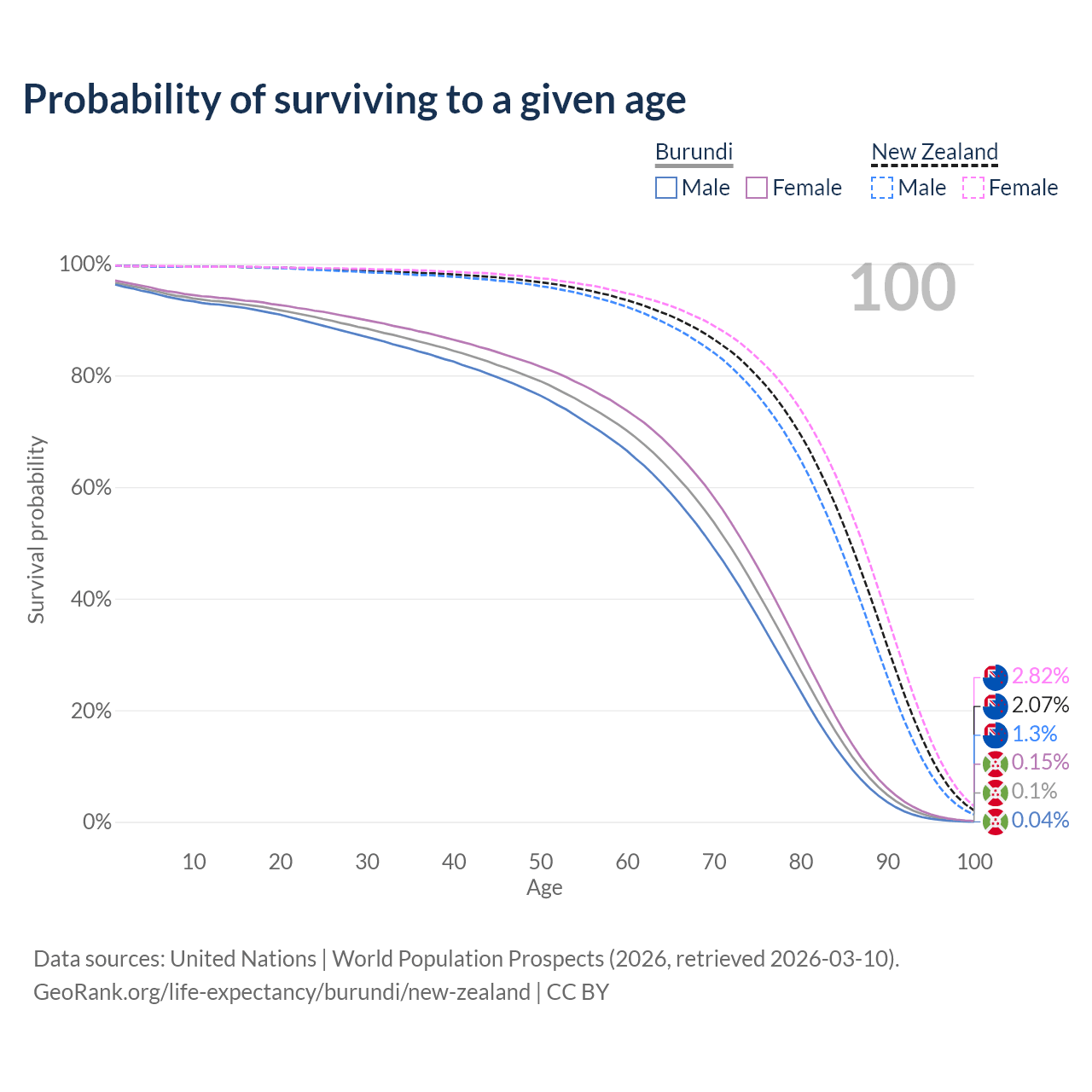 This life expectancy calculator shows the odds of living to 100, 95, 90, and below based on current age for both males and females in Burundi and New Zealand, along with mean and median age of death. The calculations are based on the 2026 life tables (actuarial tables) from the UN World Population Prospects.