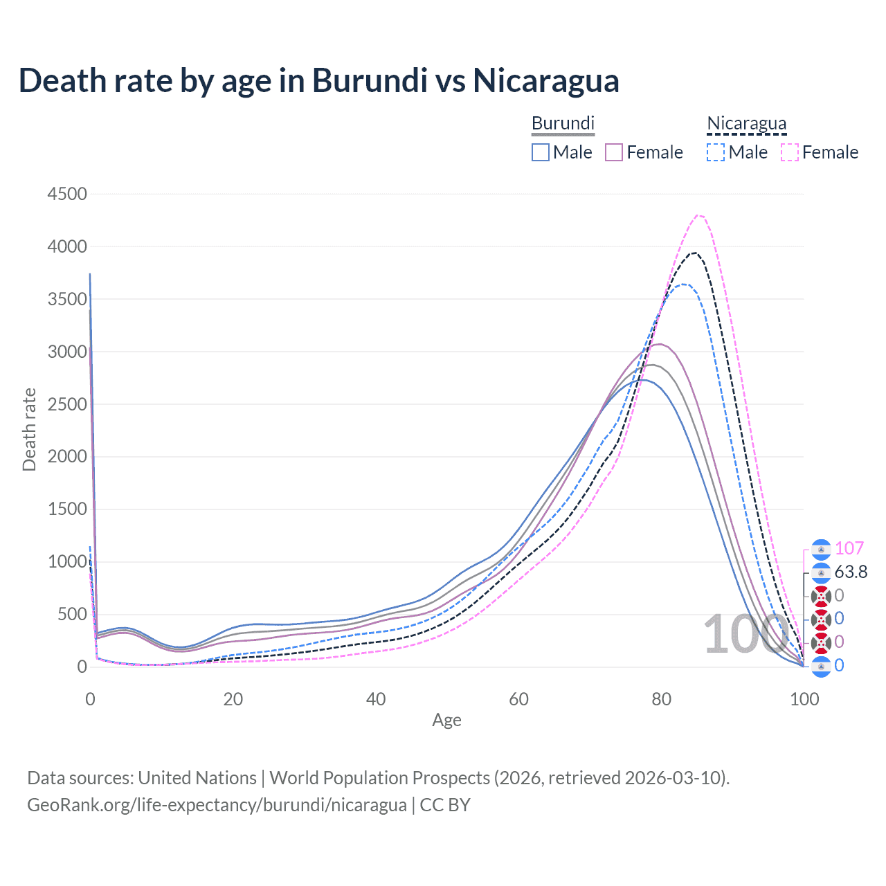 In Burundi, the most common age of death is 0, compared to 85 in Nicaragua. The median age of death is 71.6 in Burundi and 79.9 in Nicaragua, meaning only half of each cohort is expected to live past that age.