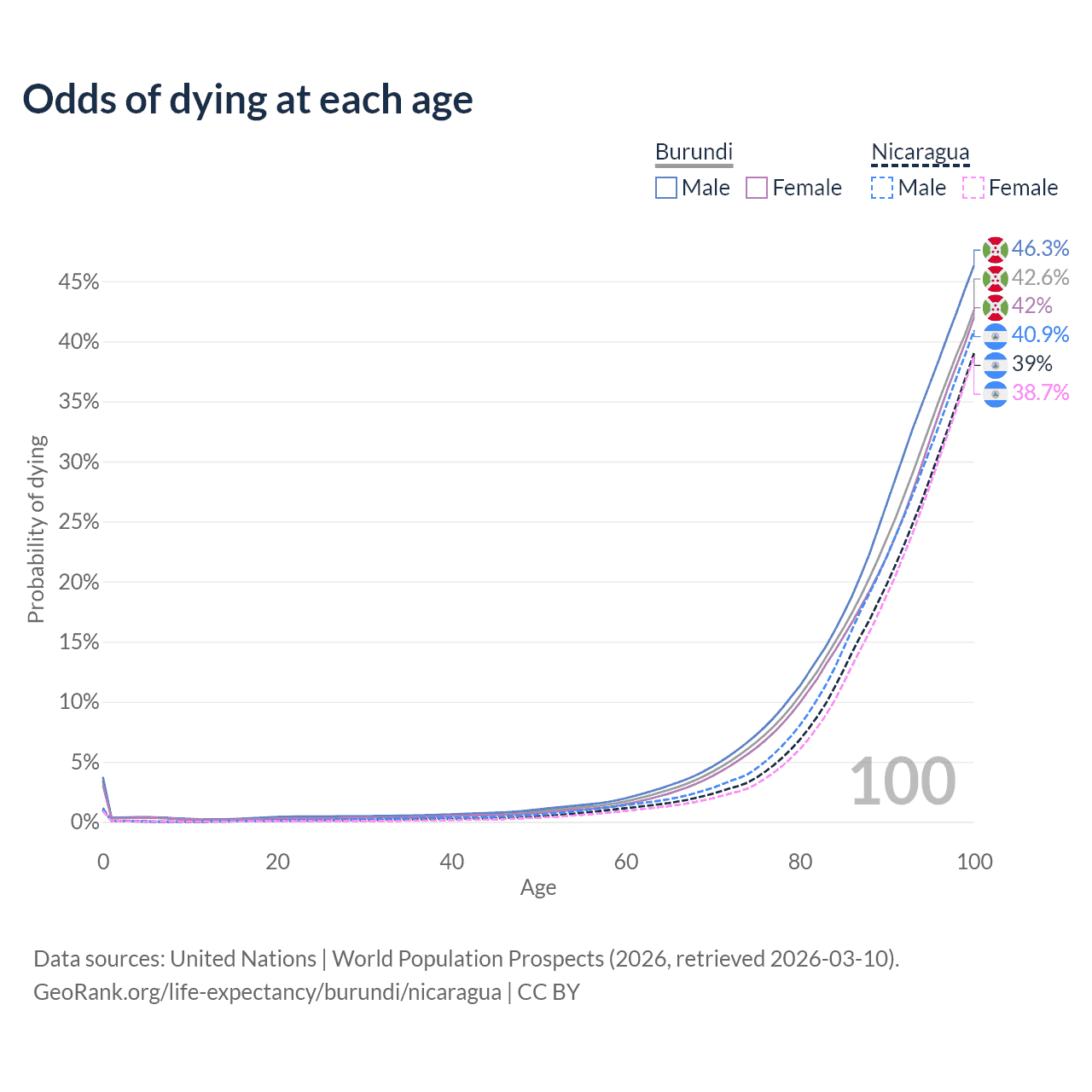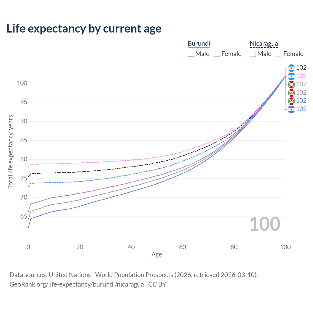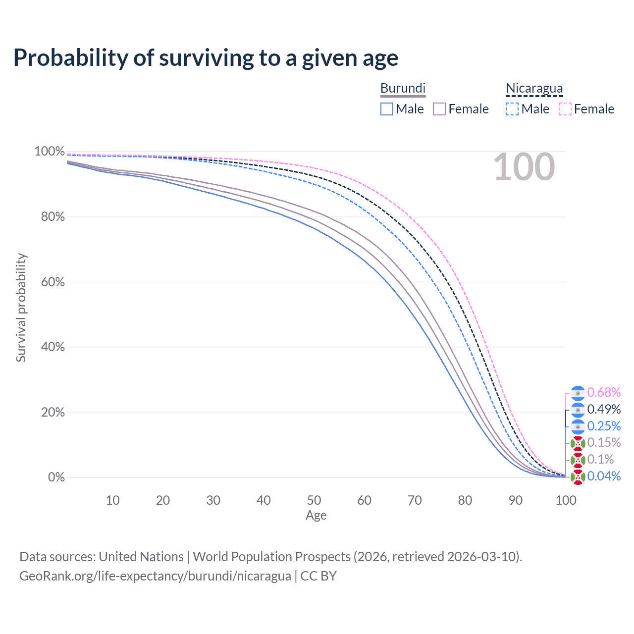 This life expectancy calculator shows the odds of living to 100, 95, 90, and below based on current age for both males and females in Burundi and Nicaragua, along with mean and median age of death. The calculations are based on the 2026 life tables (actuarial tables) from the UN World Population Prospects.
