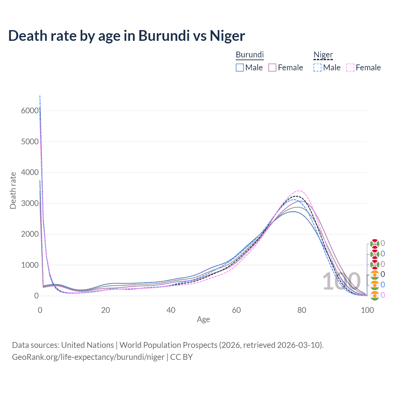 In Burundi, the most common age of death is 0, compared to 0 in Niger. The median age of death is 71.6 in Burundi and 71.7 in Niger, meaning only half of each cohort is expected to live past that age.