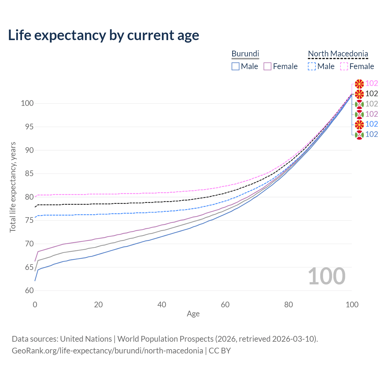 This life expectancy calculator shows the odds of living to 100, 95, 90, and below based on current age for both males and females in Burundi and North Macedonia, along with mean and median age of death. The calculations are based on the 2026 life tables (actuarial tables) from the UN World Population Prospects.