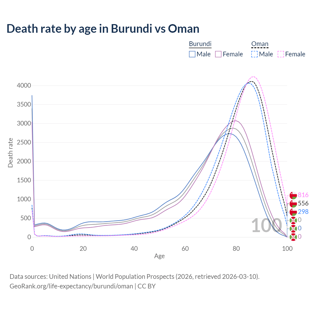 In Burundi, the most common age of death is 0, compared to 86 in Oman. The median age of death is 71.6 in Burundi and 83.5 in Oman, meaning only half of each cohort is expected to live past that age.