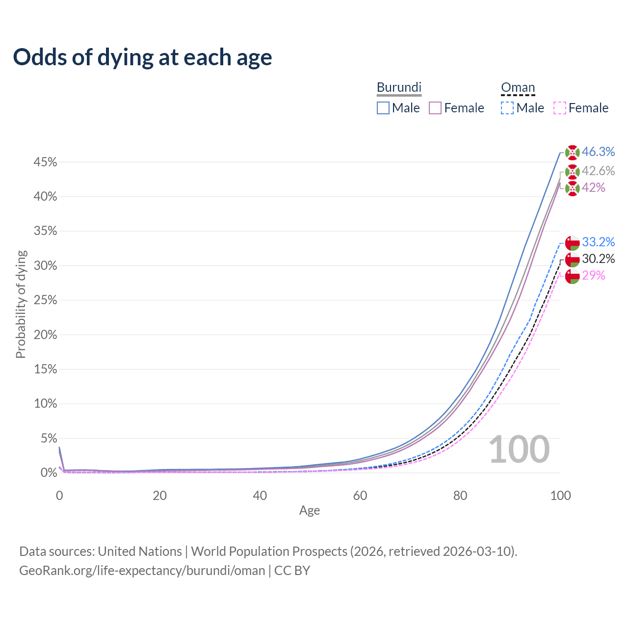 This life expectancy calculator shows the odds of living to 100, 95, 90, and below based on current age for both males and females in Burundi and Oman, along with mean and median age of death. The calculations are based on the 2026 life tables (actuarial tables) from the UN World Population Prospects.