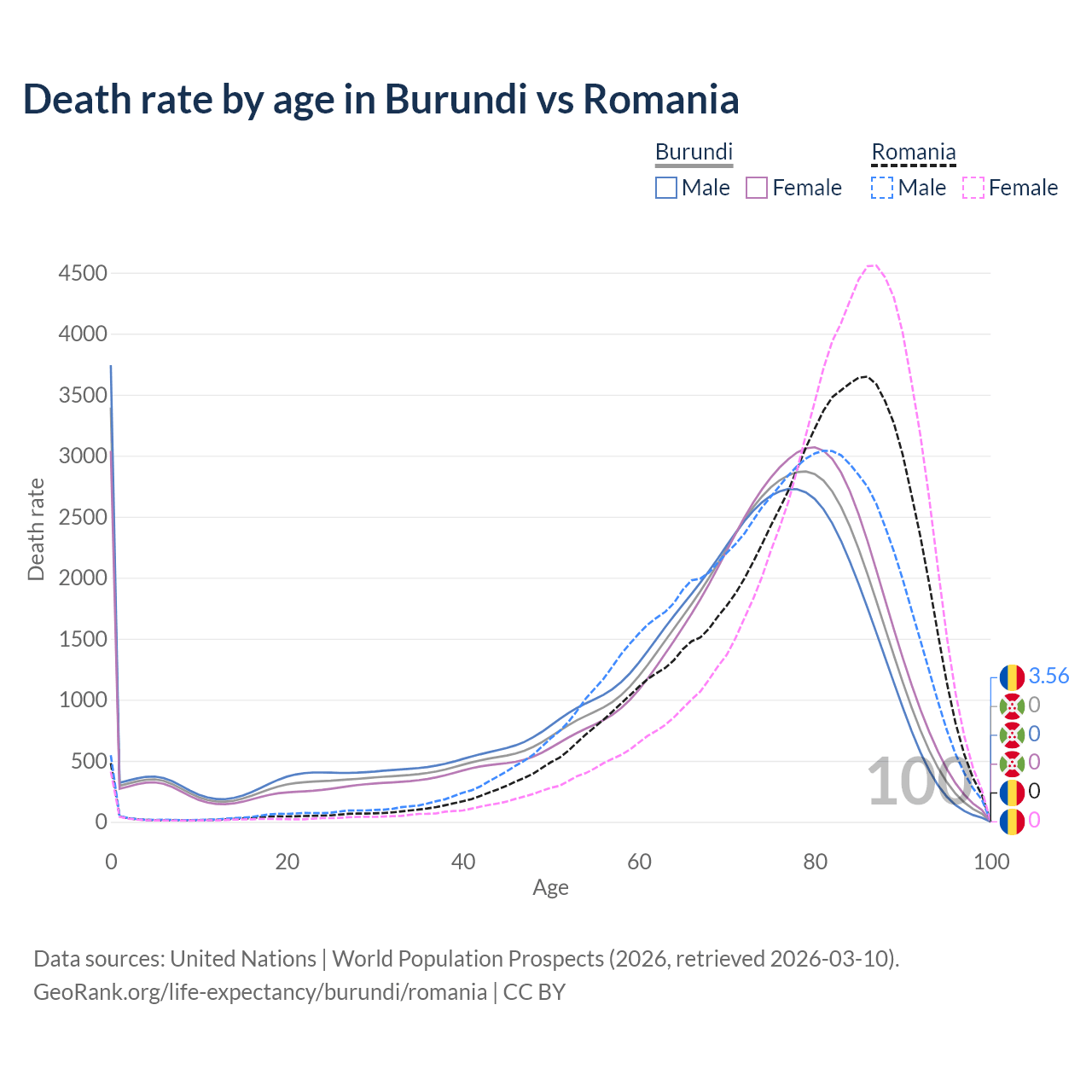 In Burundi, the most common age of death is 0, compared to 86 in Romania. The median age of death is 71.6 in Burundi and 79.9 in Romania, meaning only half of each cohort is expected to live past that age.
