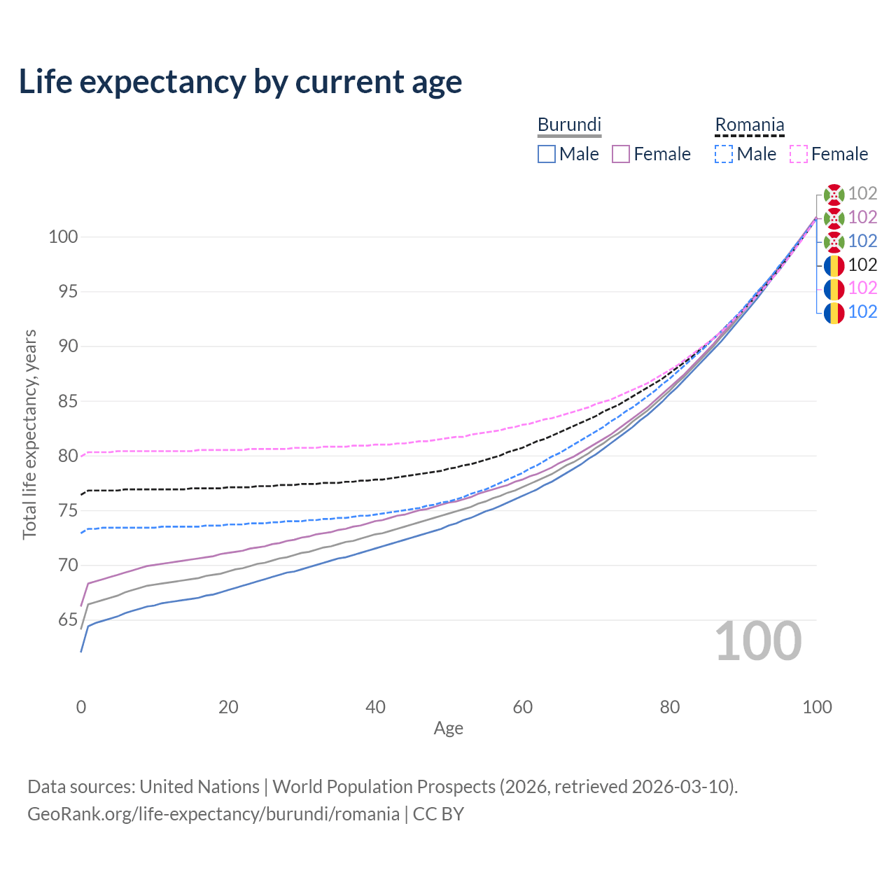 This life expectancy calculator shows the odds of living to 100, 95, 90, and below based on current age for both males and females in Burundi and Romania, along with mean and median age of death. The calculations are based on the 2026 life tables (actuarial tables) from the UN World Population Prospects.