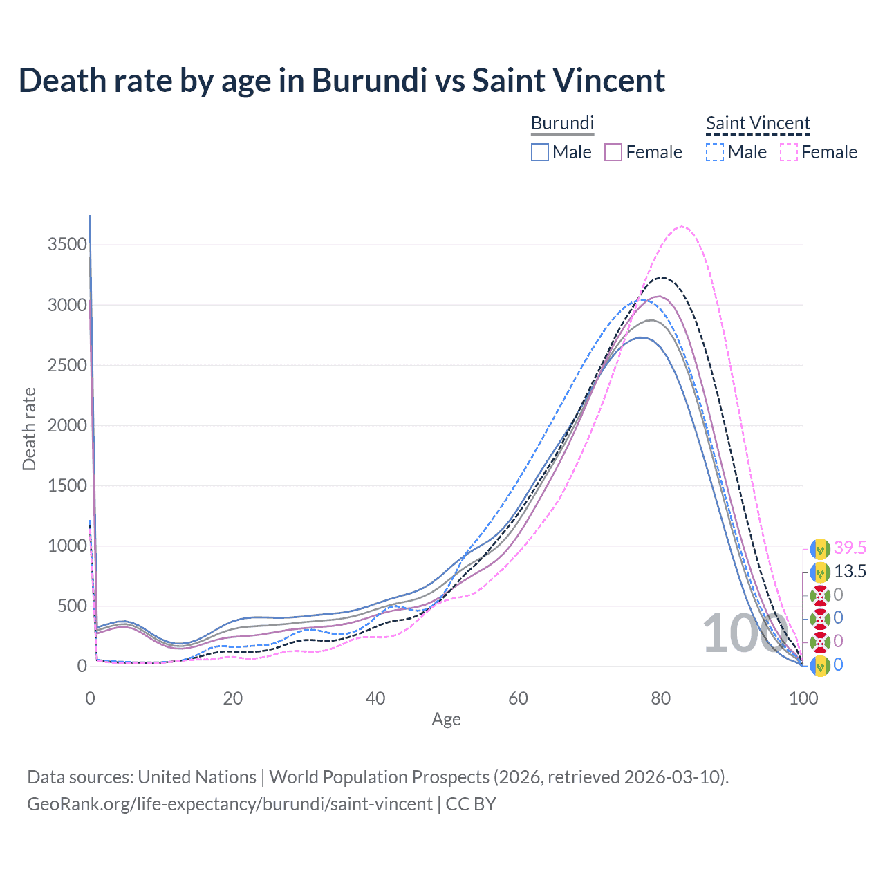 In Burundi, the most common age of death is 0, compared to 80 in Saint Vincent. The median age of death is 71.6 in Burundi and 75.6 in Saint Vincent, meaning only half of each cohort is expected to live past that age.