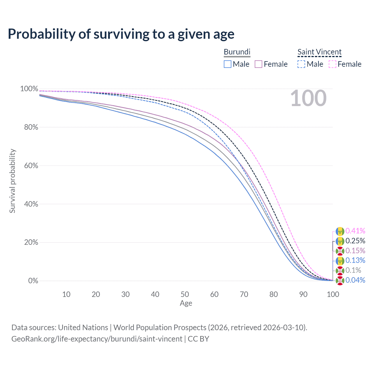 This life expectancy calculator shows the odds of living to 100, 95, 90, and below based on current age for both males and females in Burundi and Saint Vincent, along with mean and median age of death. The calculations are based on the 2026 life tables (actuarial tables) from the UN World Population Prospects.