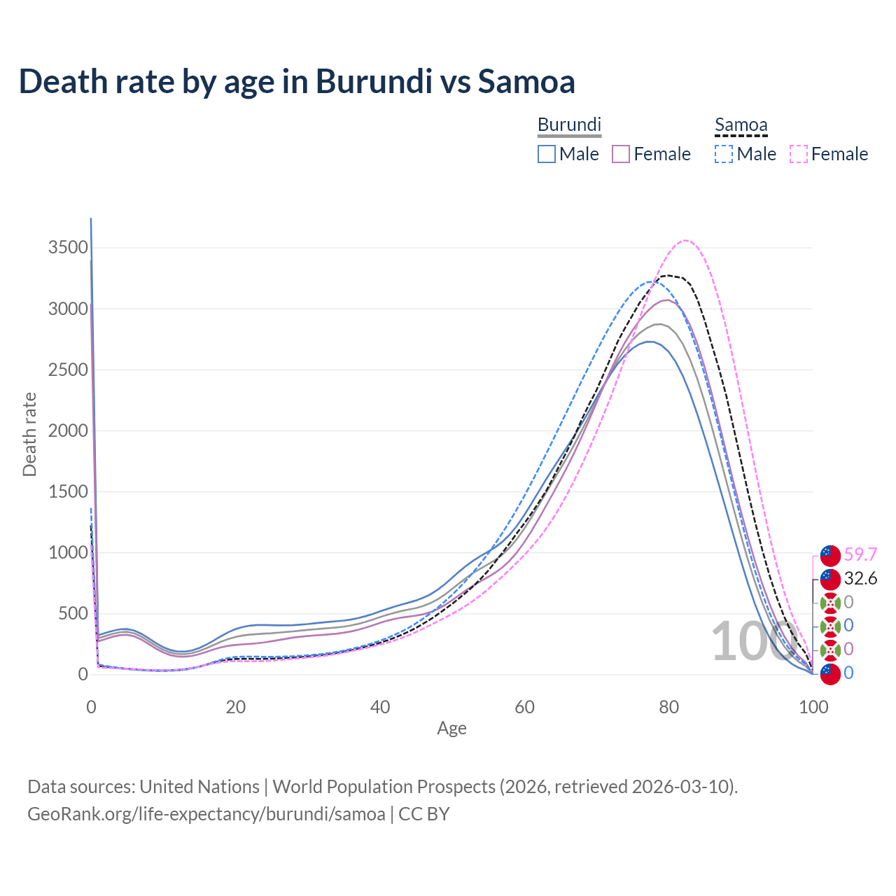 In Burundi, the most common age of death is 0, compared to 80 in Samoa. The median age of death is 71.6 in Burundi and 75.9 in Samoa, meaning only half of each cohort is expected to live past that age.