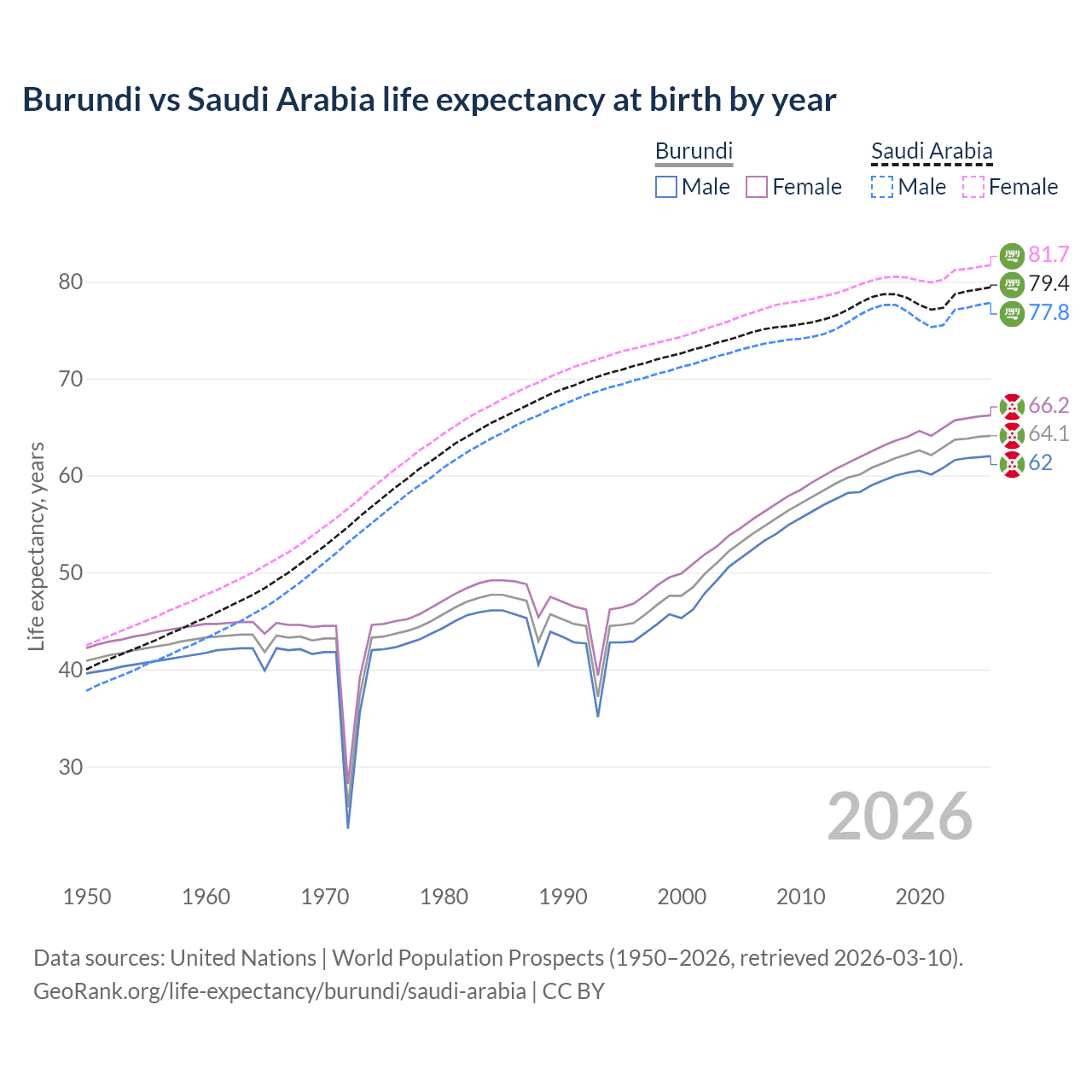 The average life expectancy at birth is 64.1 years in Burundi vs 79.4 in Saudi Arabia. Burundi is ranked 179/197 by life expectancy, and Saudi Arabia is 49/197. In Burundi, the life expectancy is 62 years for males and 66.2 years for females. In Saudi Arabia, it's 77.8 years for males and 81.7 years for females.