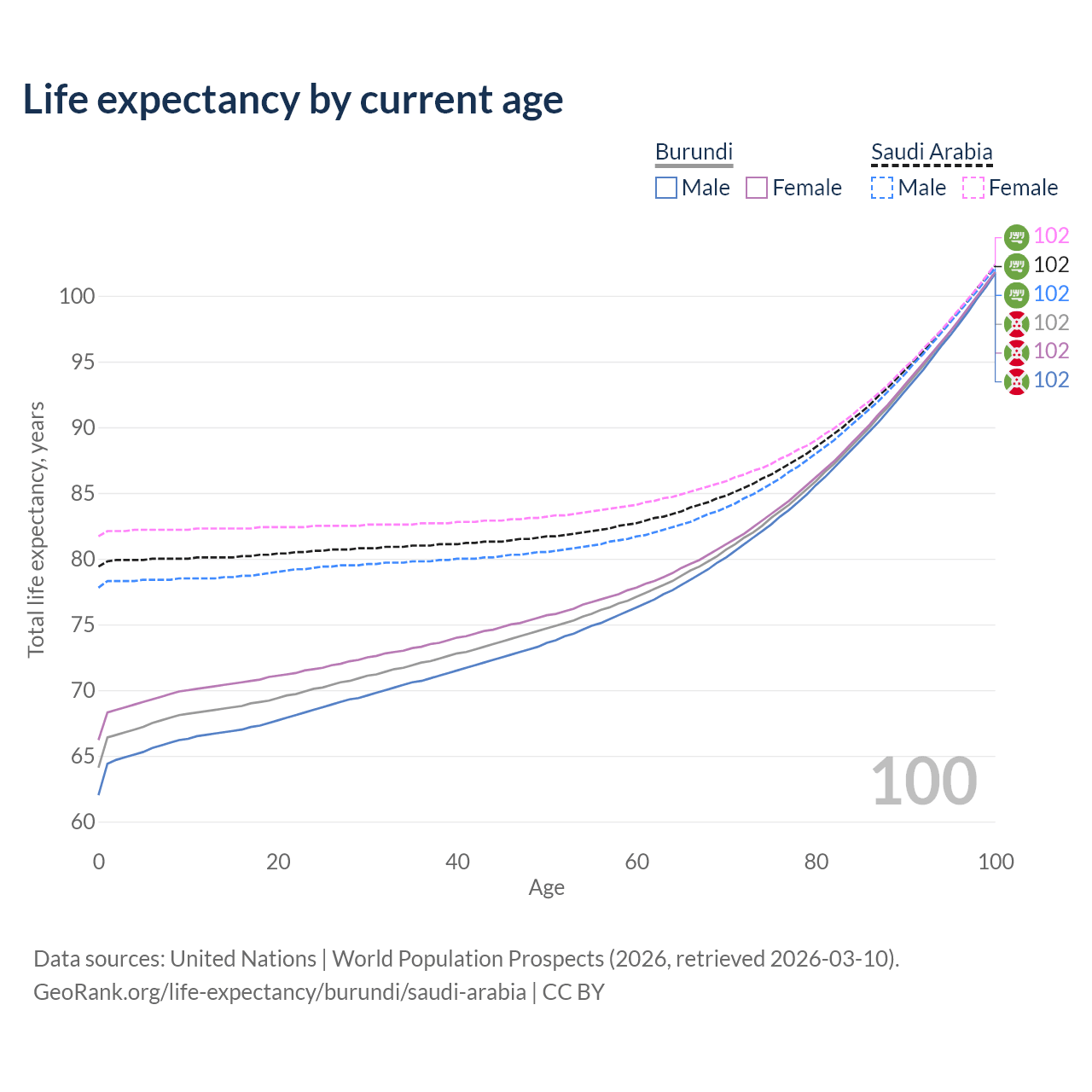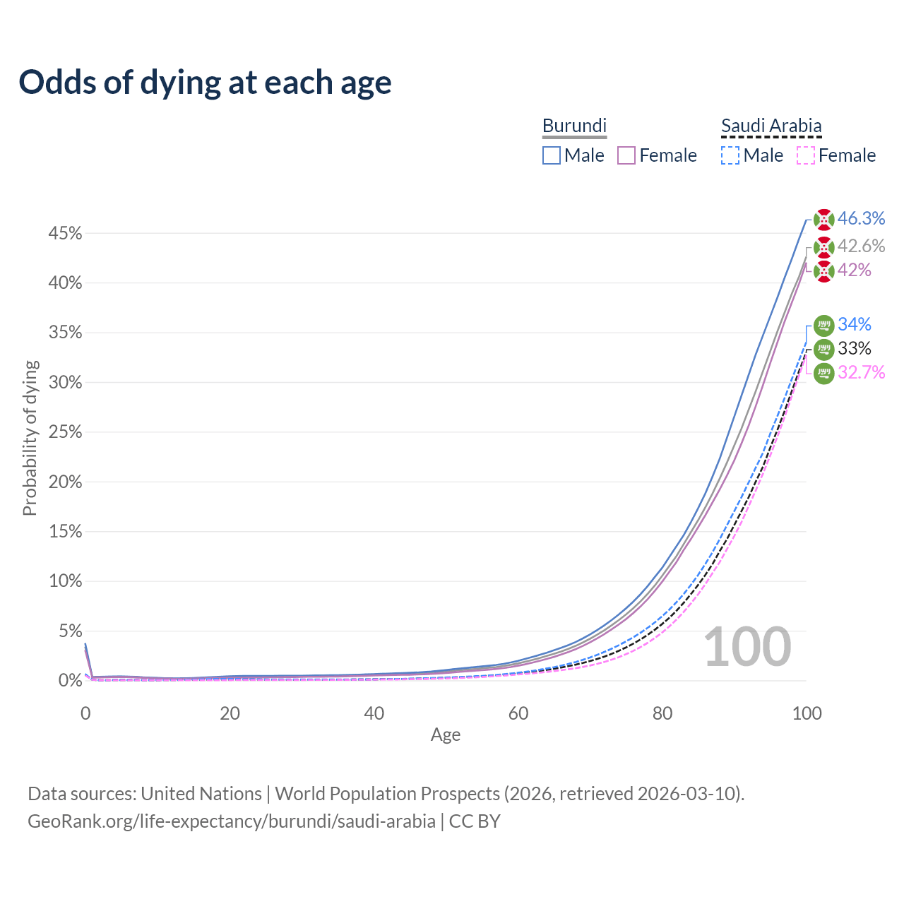 This life expectancy calculator shows the odds of living to 100, 95, 90, and below based on current age for both males and females in Burundi and Saudi Arabia, along with mean and median age of death. The calculations are based on the 2026 life tables (actuarial tables) from the UN World Population Prospects.
