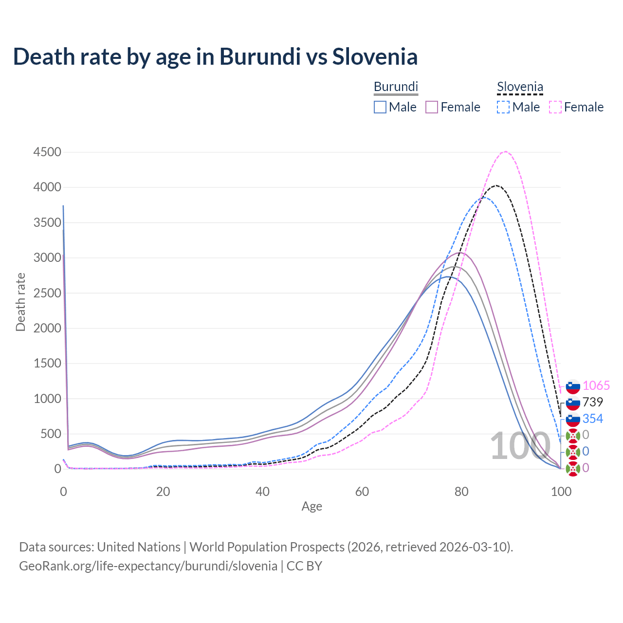 In Burundi, the most common age of death is 0, compared to 87 in Slovenia. The median age of death is 71.6 in Burundi and 84.4 in Slovenia, meaning only half of each cohort is expected to live past that age.