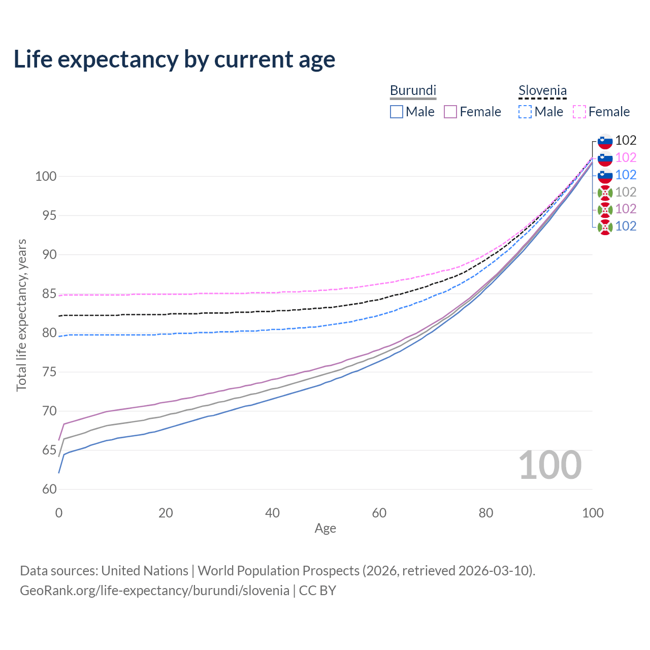 This life expectancy calculator shows the odds of living to 100, 95, 90, and below based on current age for both males and females in Burundi and Slovenia, along with mean and median age of death. The calculations are based on the 2026 life tables (actuarial tables) from the UN World Population Prospects.