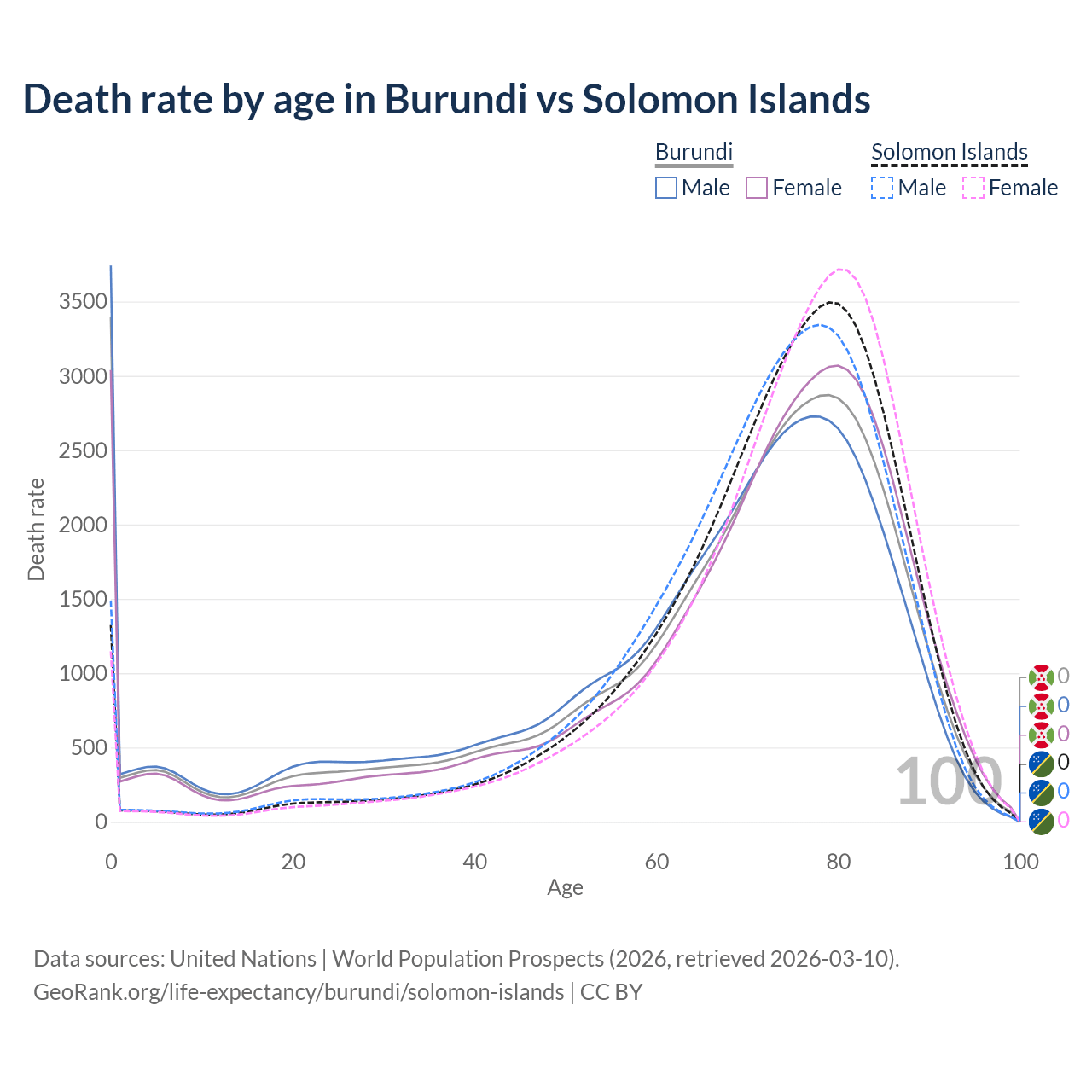 In Burundi, the most common age of death is 0, compared to 79 in the Solomon Islands. The median age of death is 71.6 in Burundi and 74.9 in the Solomon Islands, meaning only half of each cohort is expected to live past that age.