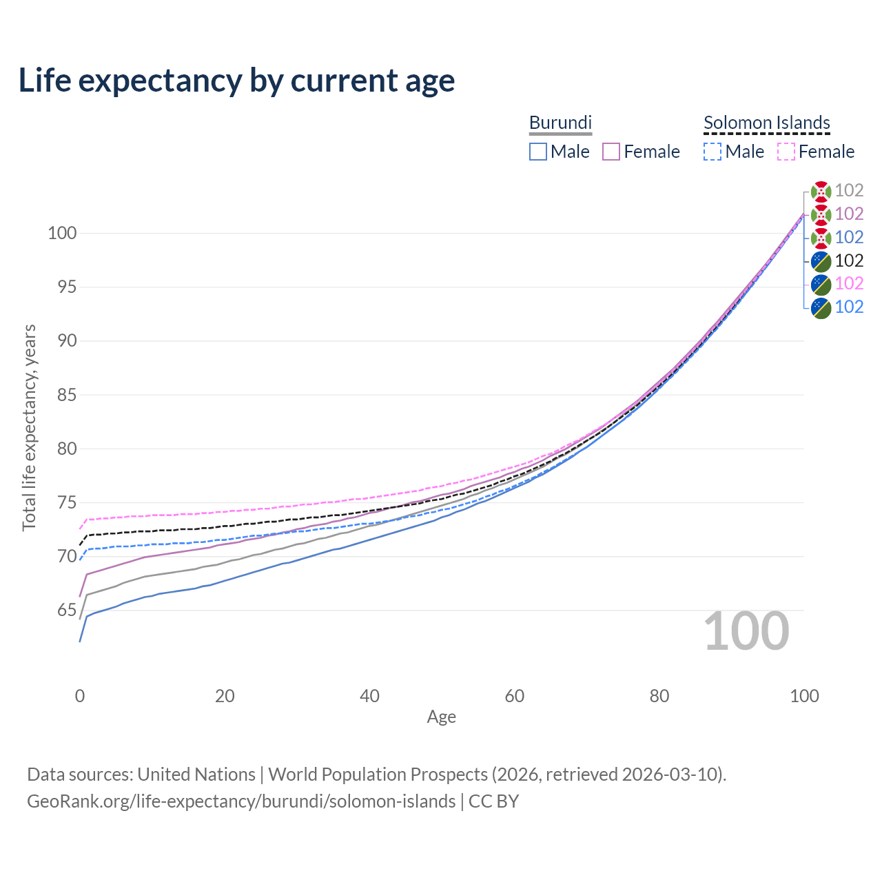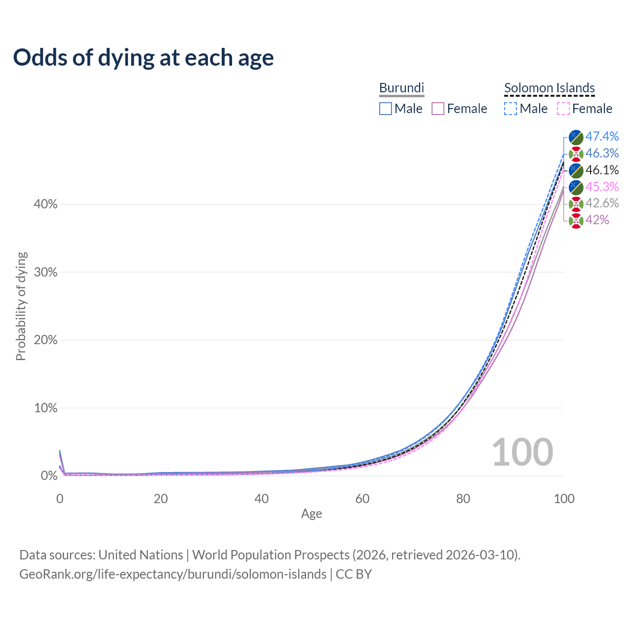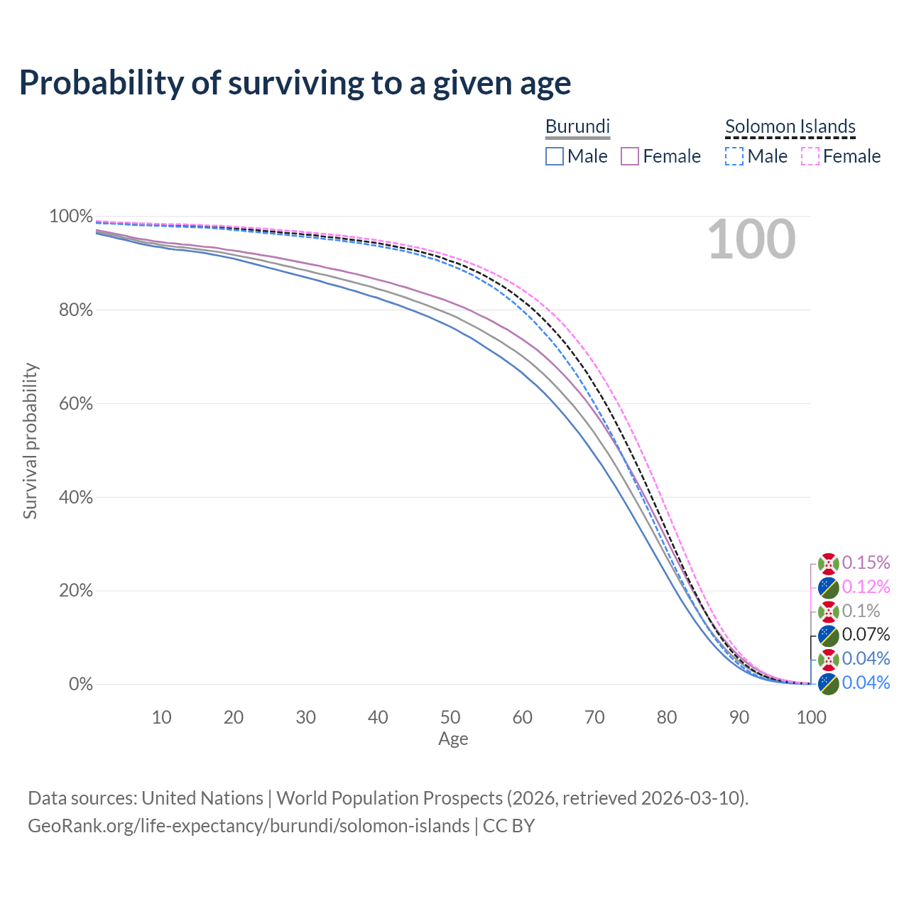 This life expectancy calculator shows the odds of living to 100, 95, 90, and below based on current age for both males and females in Burundi and the Solomon Islands, along with mean and median age of death. The calculations are based on the 2026 life tables (actuarial tables) from the UN World Population Prospects.