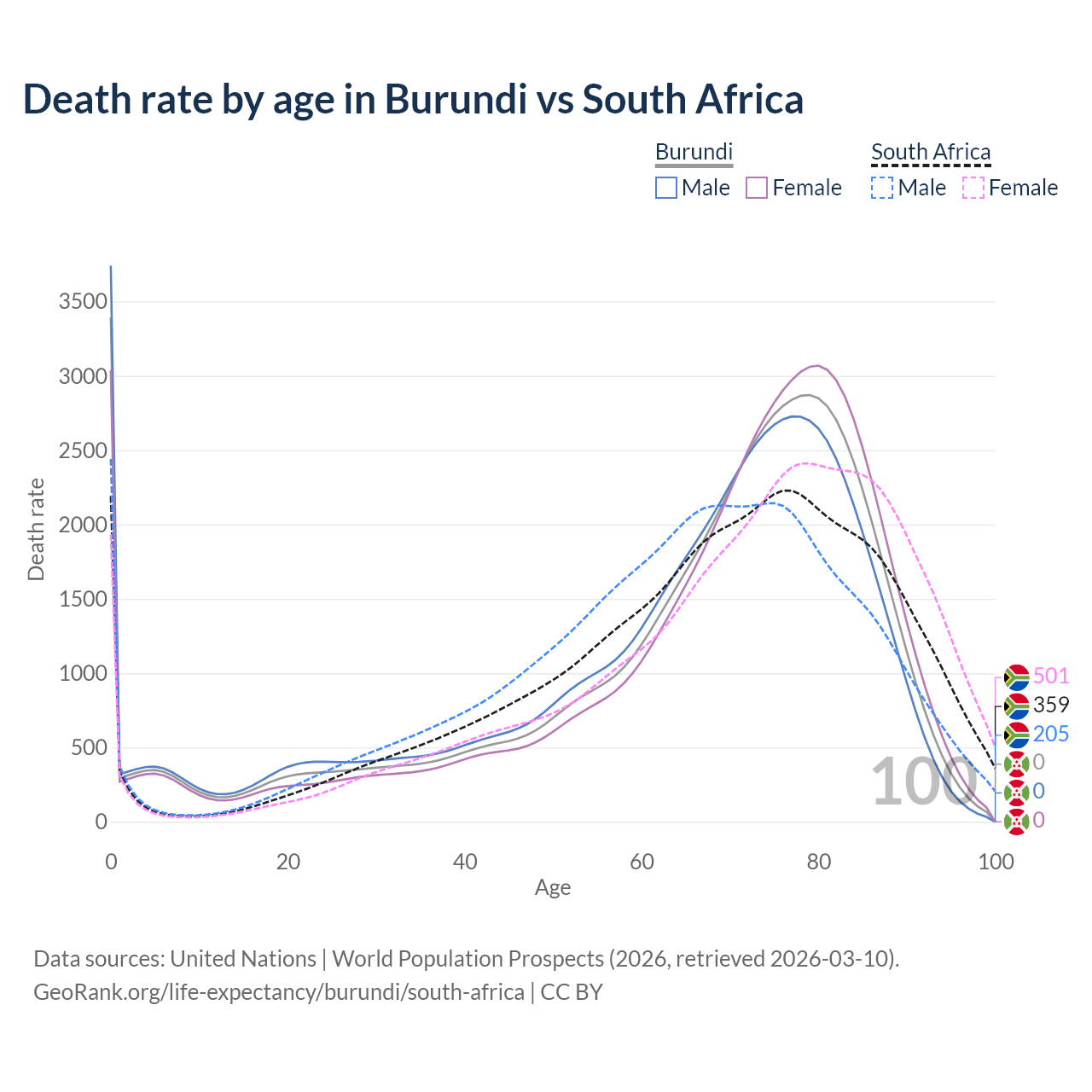 In Burundi, the most common age of death is 0, compared to 77 in South Africa. The median age of death is 71.6 in Burundi and 70.8 in South Africa, meaning only half of each cohort is expected to live past that age.