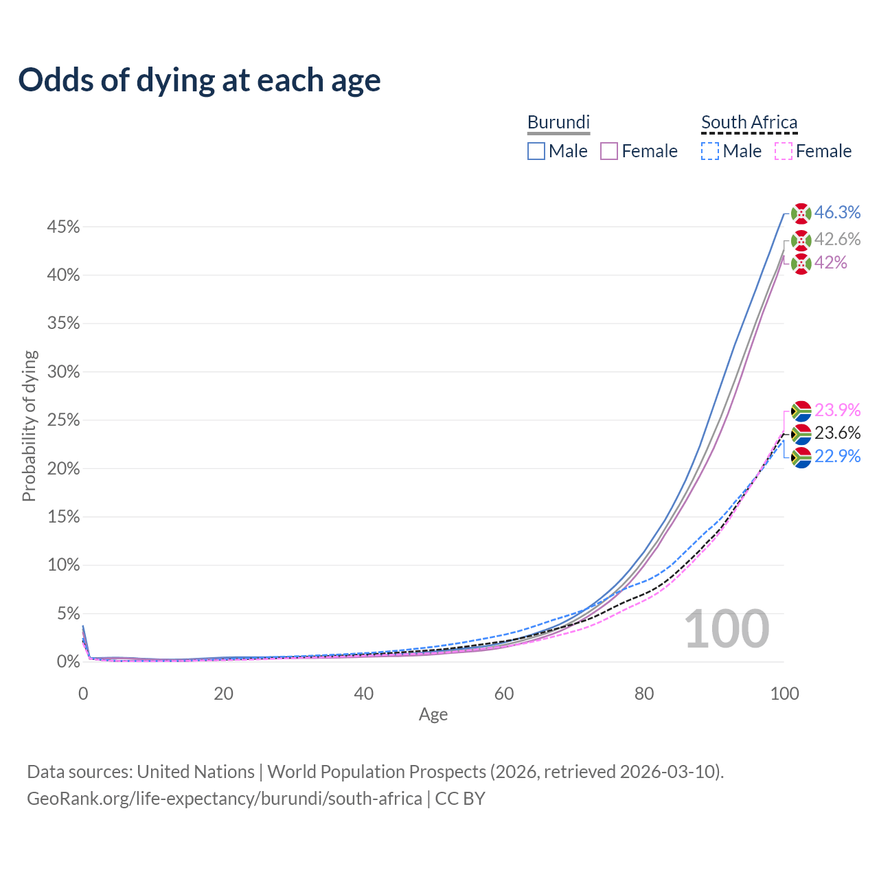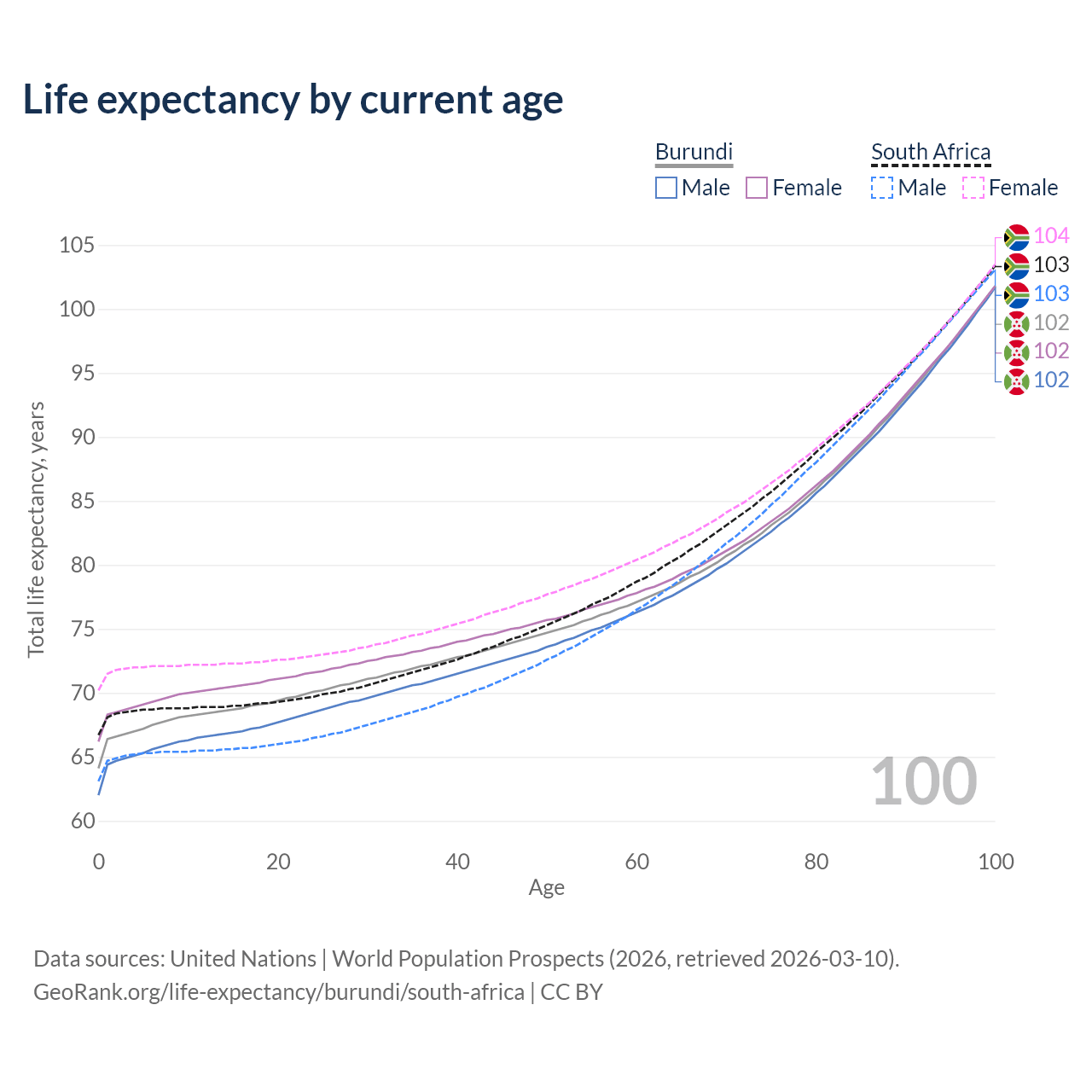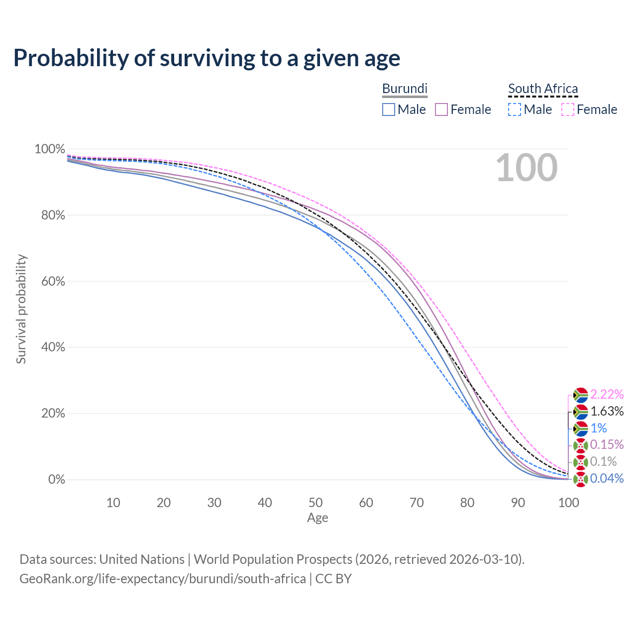 This life expectancy calculator shows the odds of living to 100, 95, 90, and below based on current age for both males and females in Burundi and South Africa, along with mean and median age of death. The calculations are based on the 2026 life tables (actuarial tables) from the UN World Population Prospects.