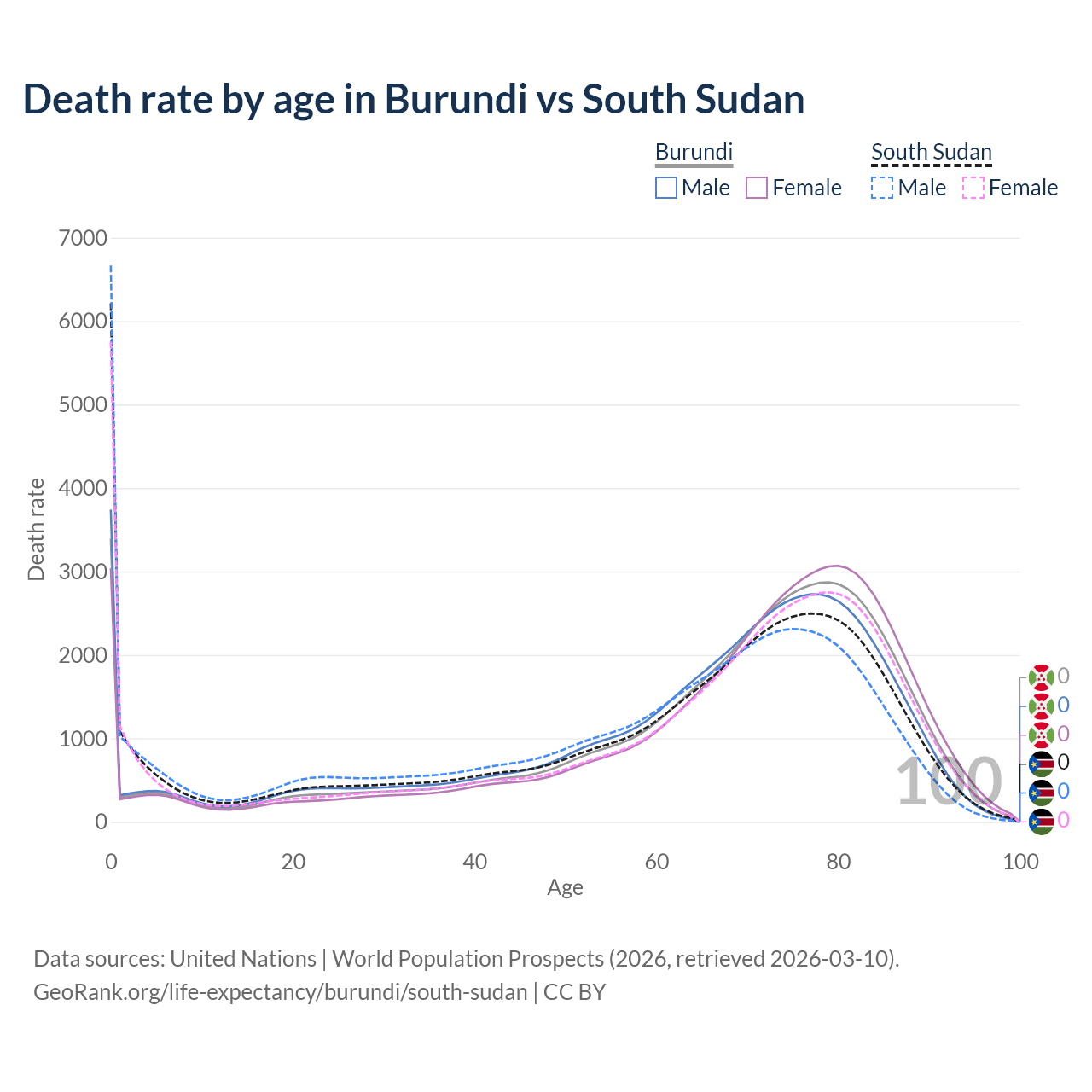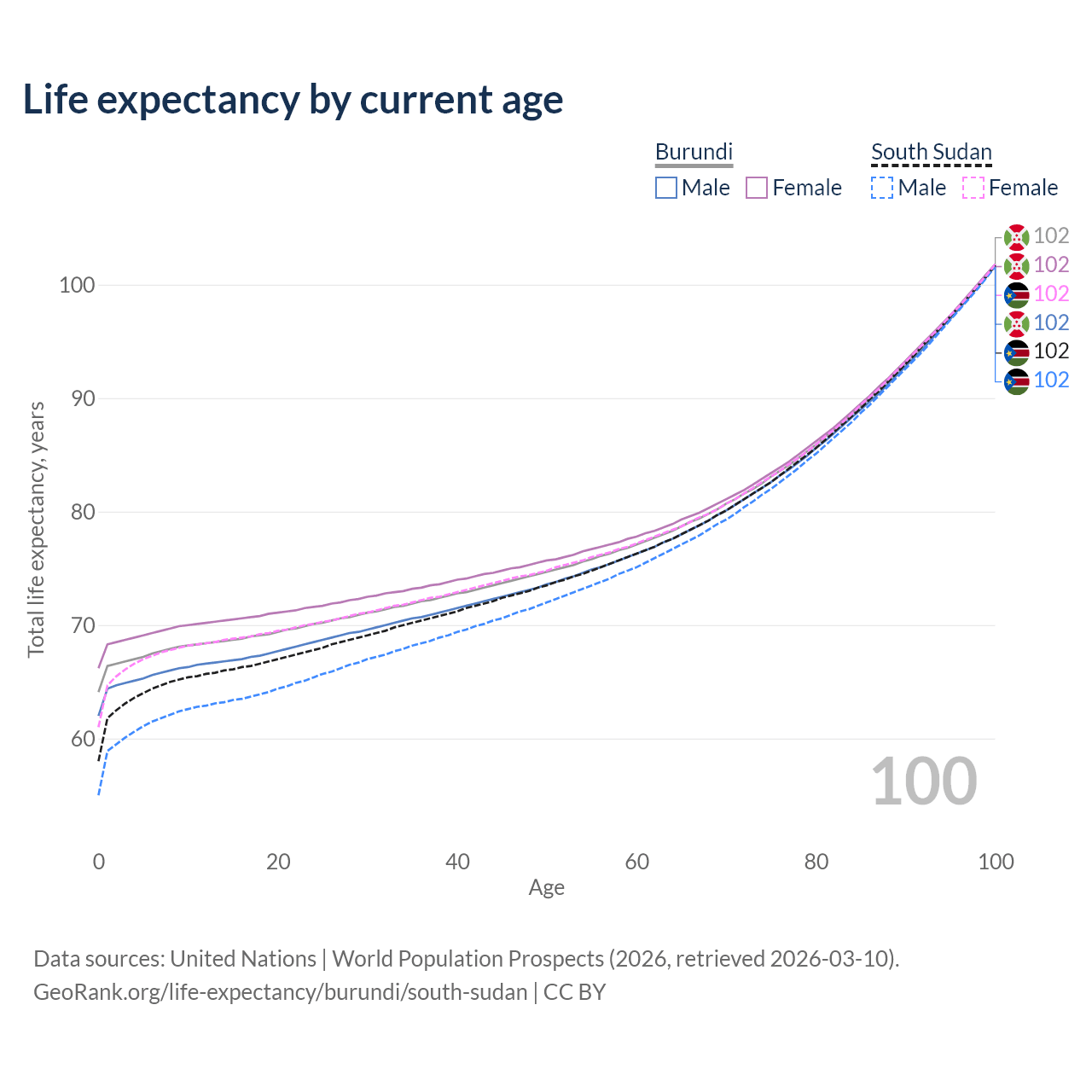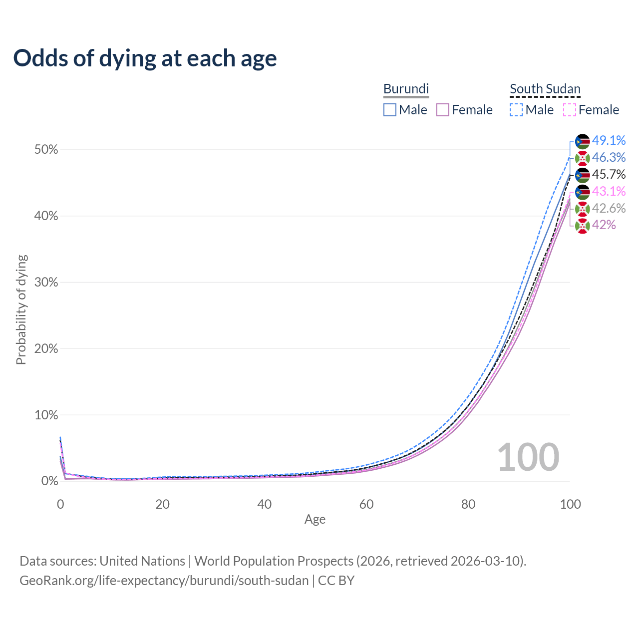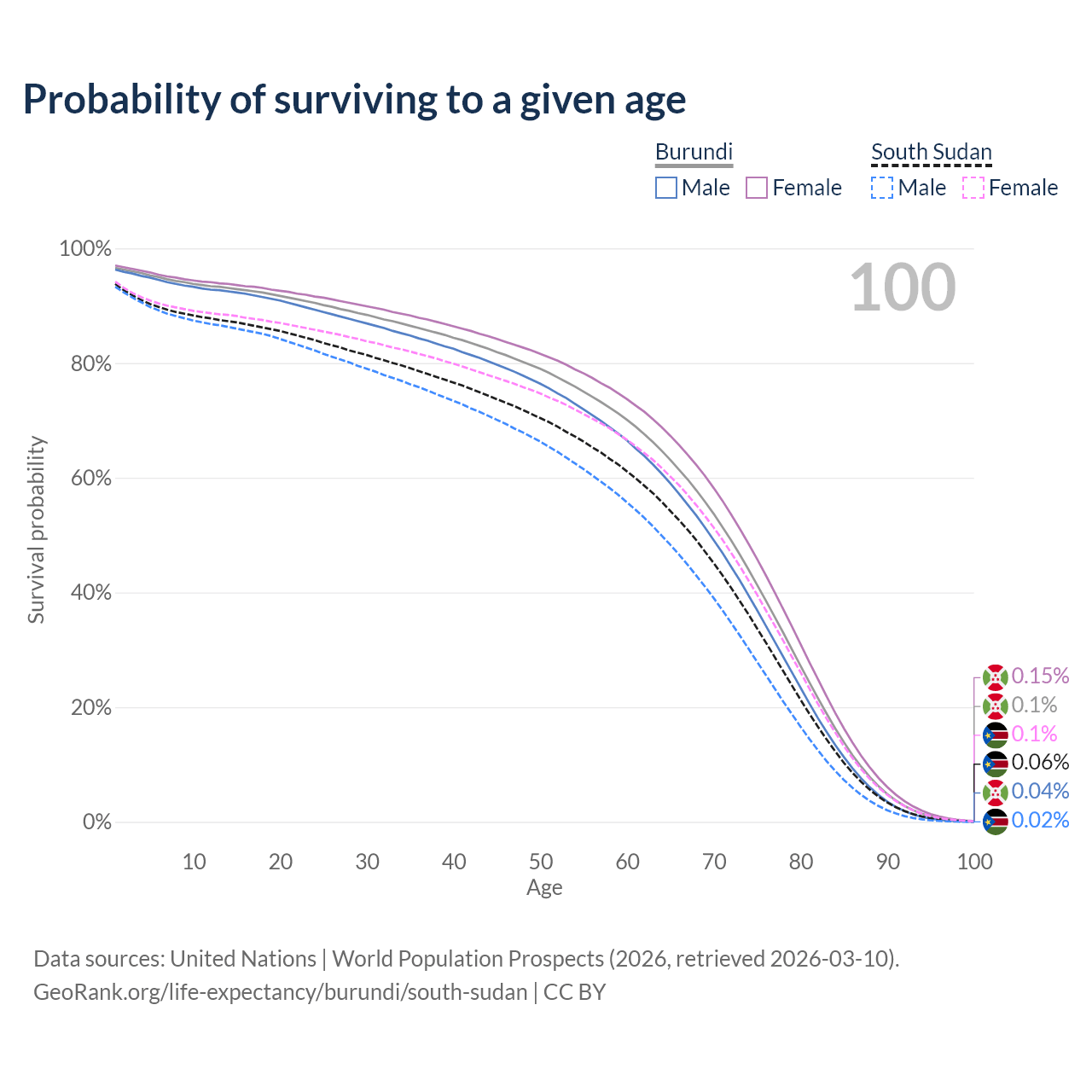 This life expectancy calculator shows the odds of living to 100, 95, 90, and below based on current age for both males and females in Burundi and South Sudan, along with mean and median age of death. The calculations are based on the 2026 life tables (actuarial tables) from the UN World Population Prospects.