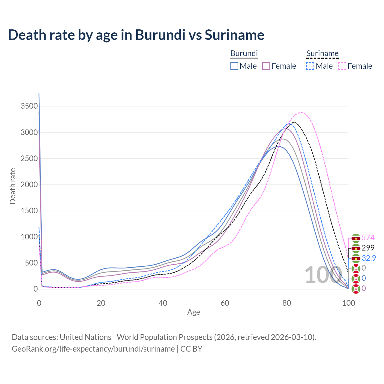 In Burundi, the most common age of death is 0, compared to 82 in Suriname. The median age of death is 71.6 in Burundi and 78 in Suriname, meaning only half of each cohort is expected to live past that age.