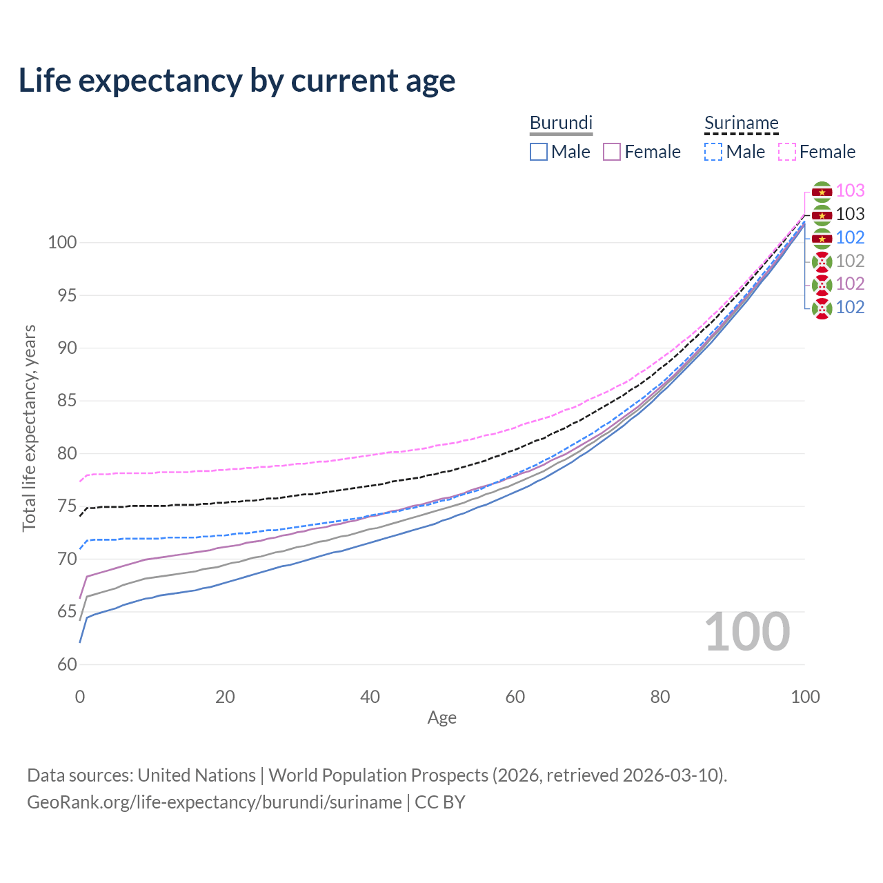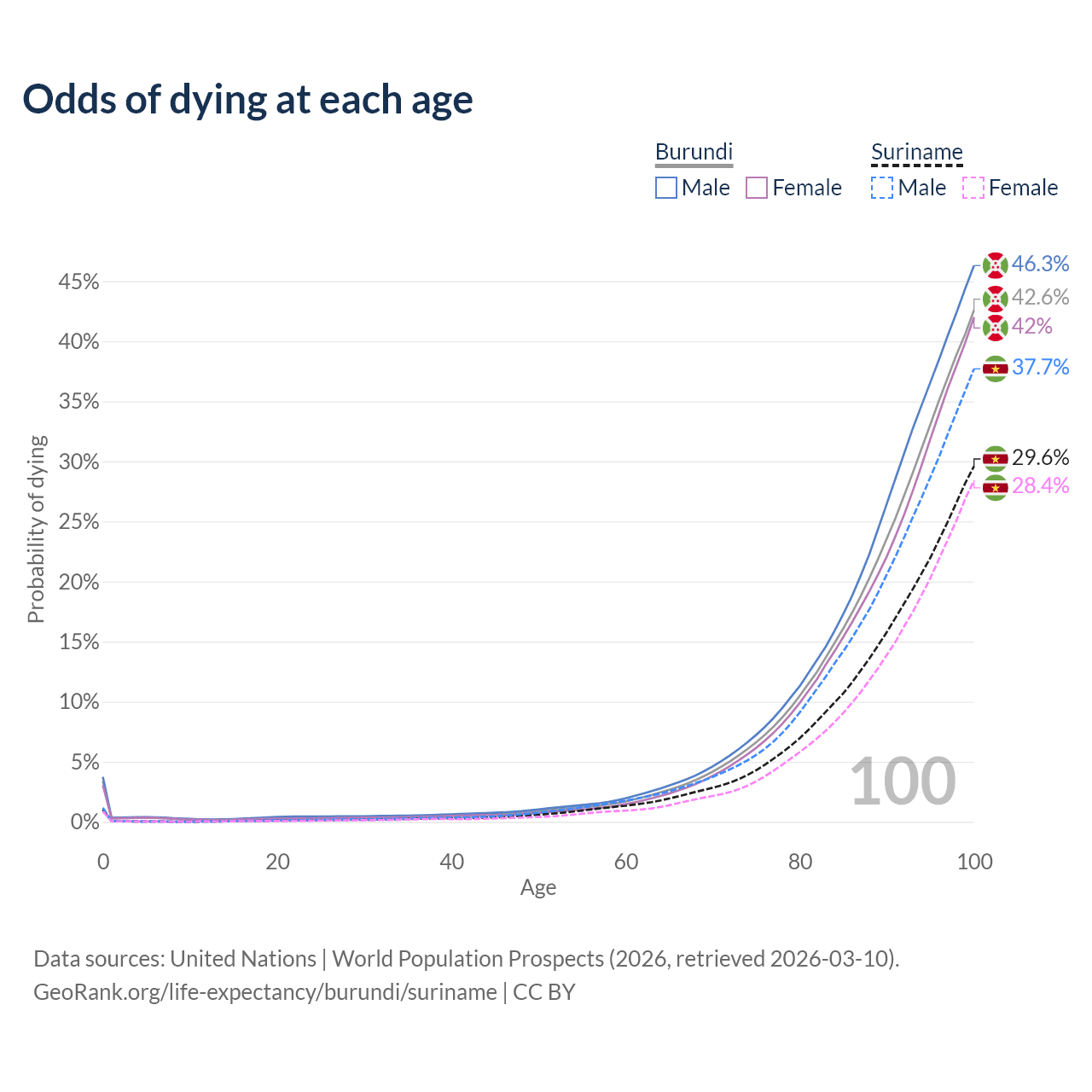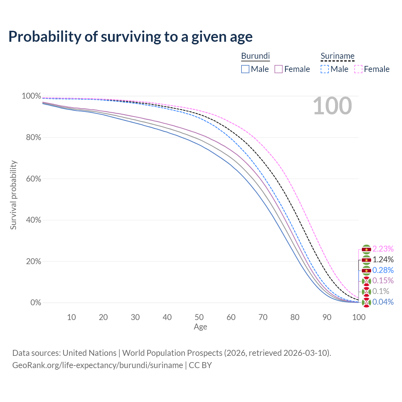 This life expectancy calculator shows the odds of living to 100, 95, 90, and below based on current age for both males and females in Burundi and Suriname, along with mean and median age of death. The calculations are based on the 2026 life tables (actuarial tables) from the UN World Population Prospects.