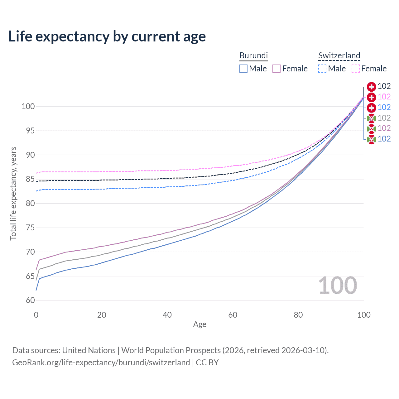 This life expectancy calculator shows the odds of living to 100, 95, 90, and below based on current age for both males and females in Burundi and Switzerland, along with mean and median age of death. The calculations are based on the 2026 life tables (actuarial tables) from the UN World Population Prospects.