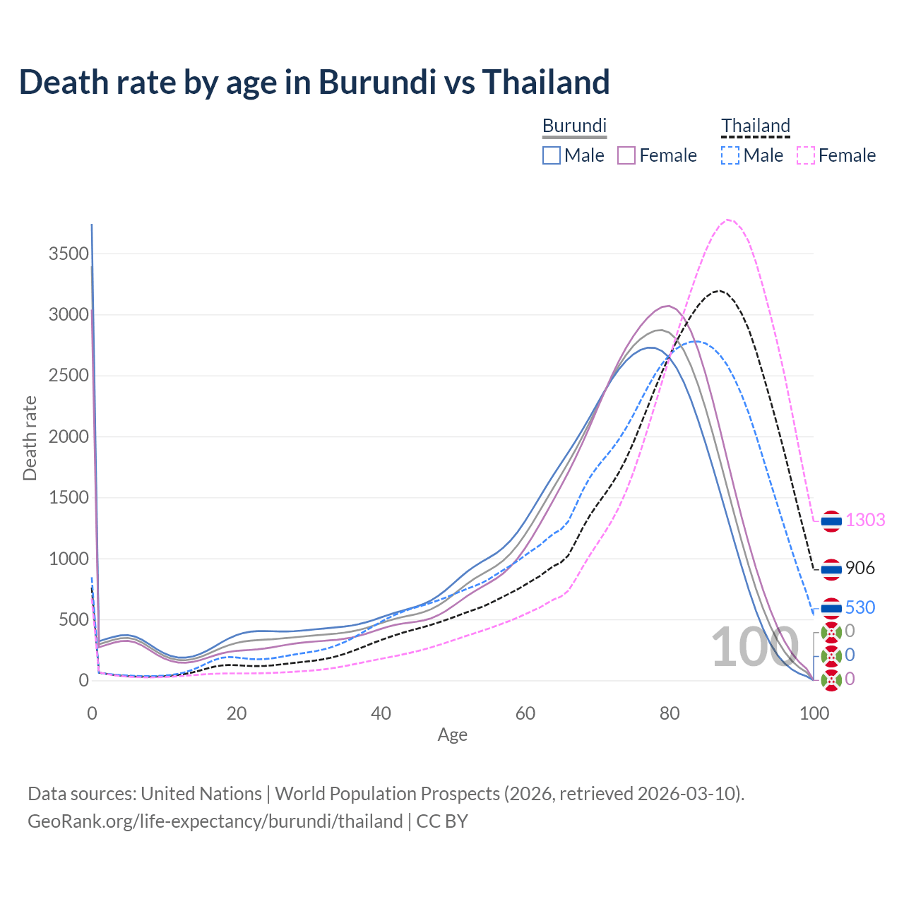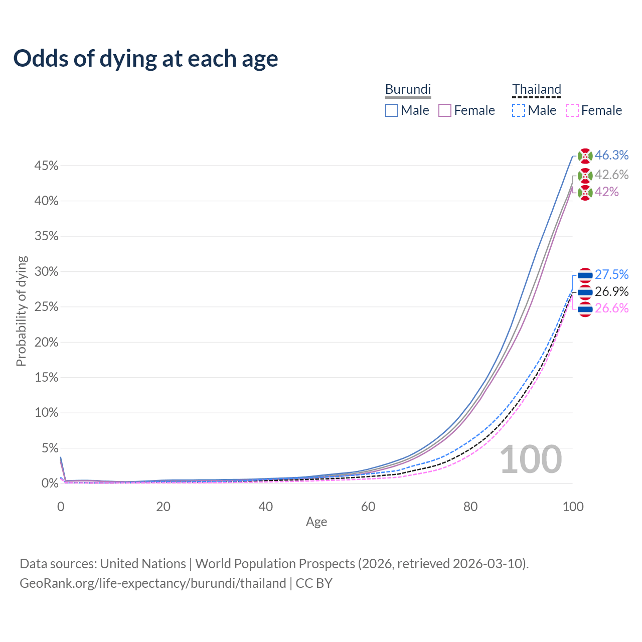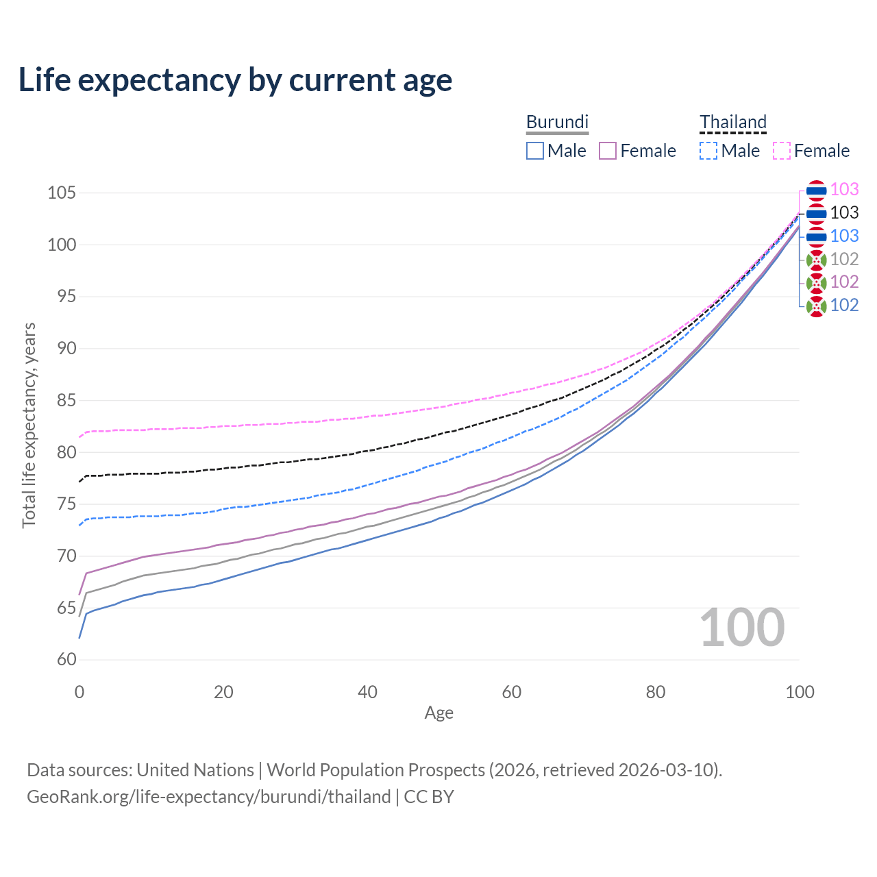 This life expectancy calculator shows the odds of living to 100, 95, 90, and below based on current age for both males and females in Burundi and Thailand, along with mean and median age of death. The calculations are based on the 2026 life tables (actuarial tables) from the UN World Population Prospects.