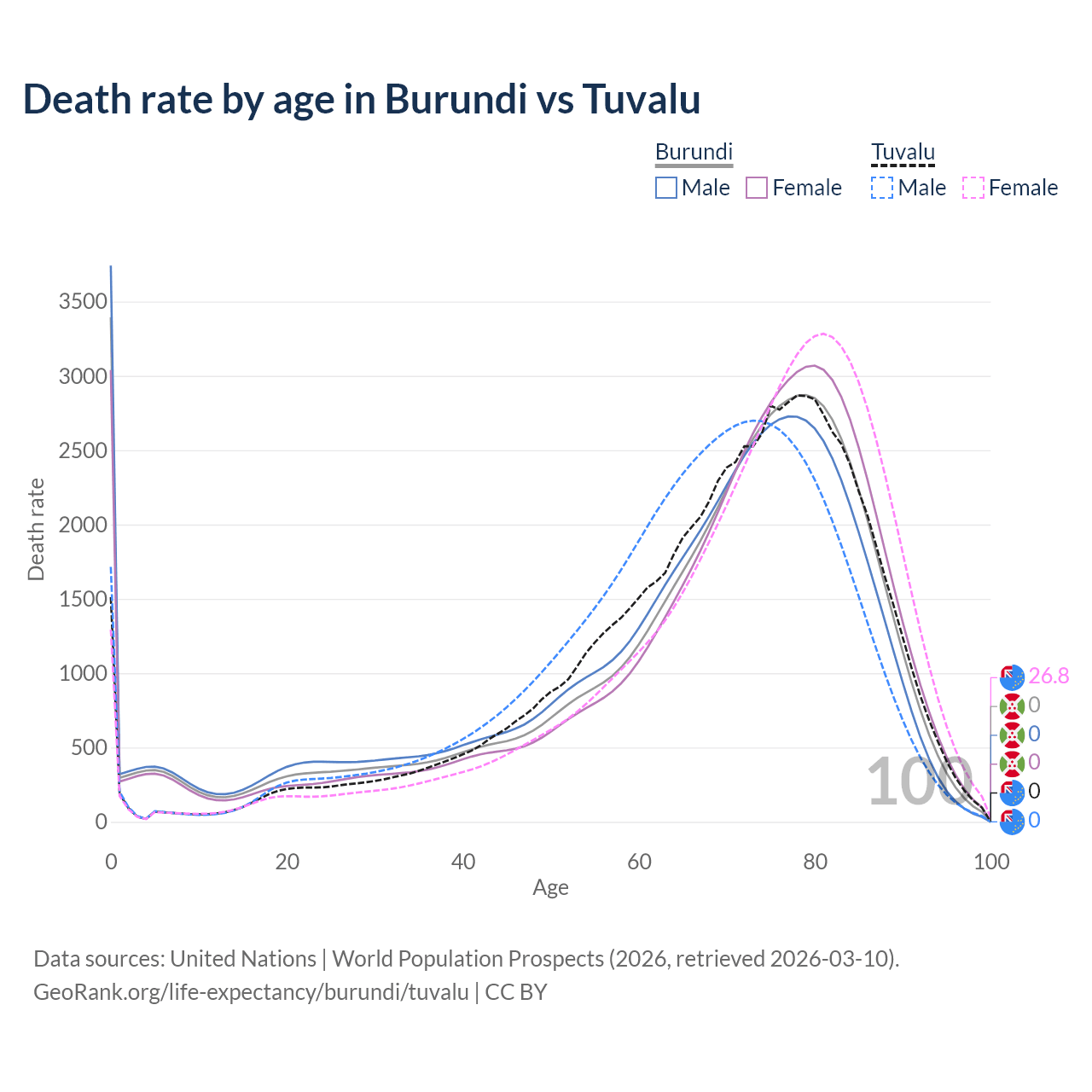 In Burundi, the most common age of death is 0, compared to 78 in Tuvalu. The median age of death is 71.6 in Burundi and 71.9 in Tuvalu, meaning only half of each cohort is expected to live past that age.