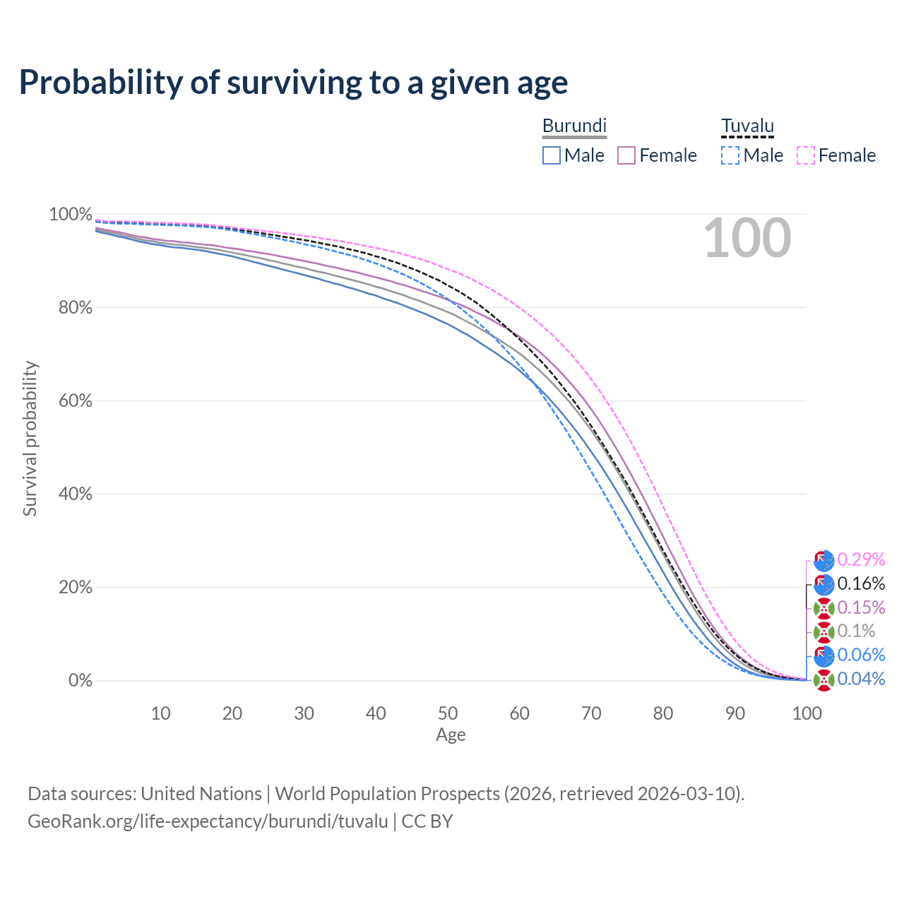 This life expectancy calculator shows the odds of living to 100, 95, 90, and below based on current age for both males and females in Burundi and Tuvalu, along with mean and median age of death. The calculations are based on the 2026 life tables (actuarial tables) from the UN World Population Prospects.