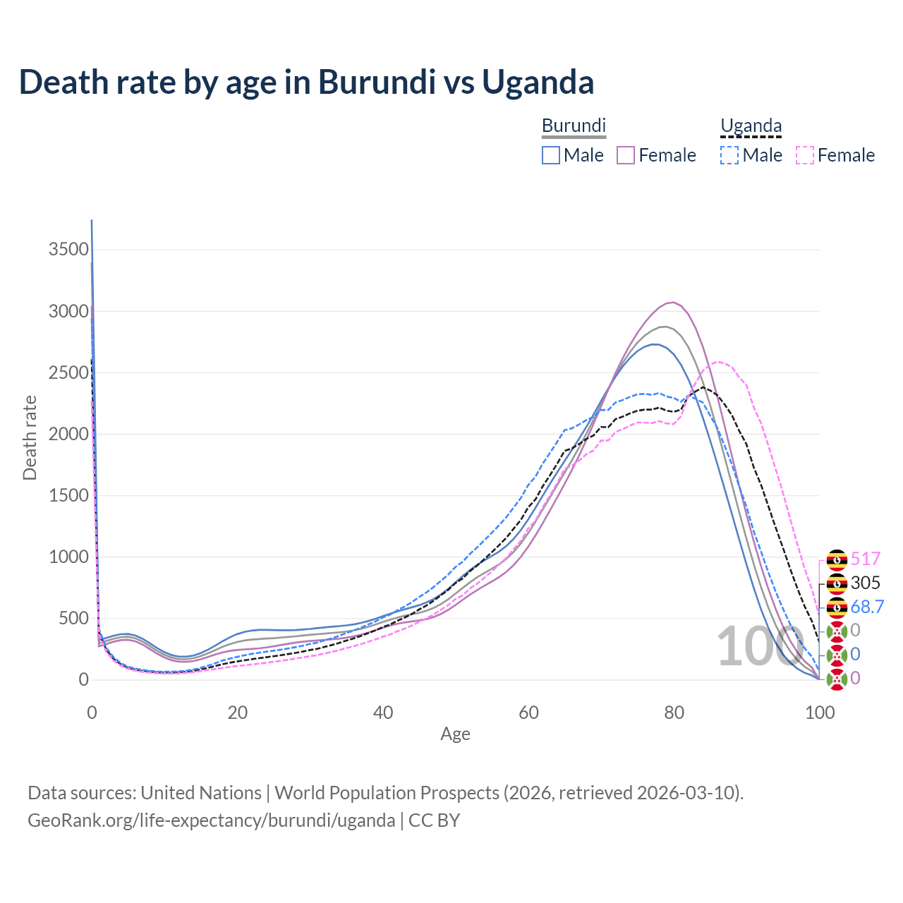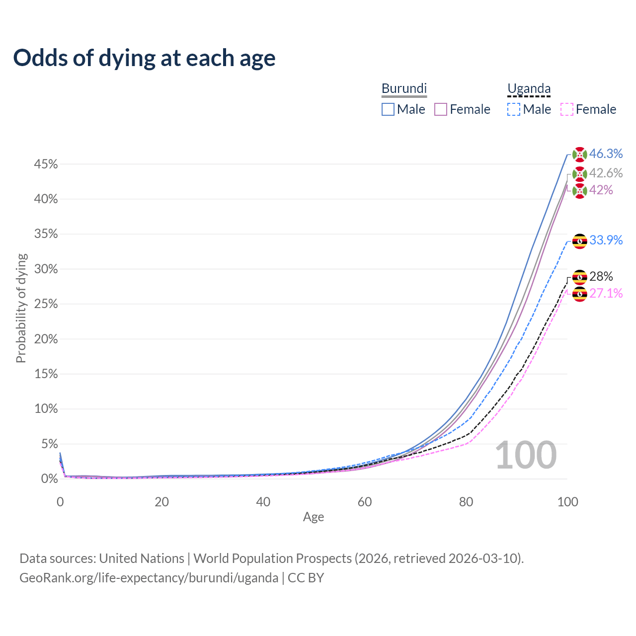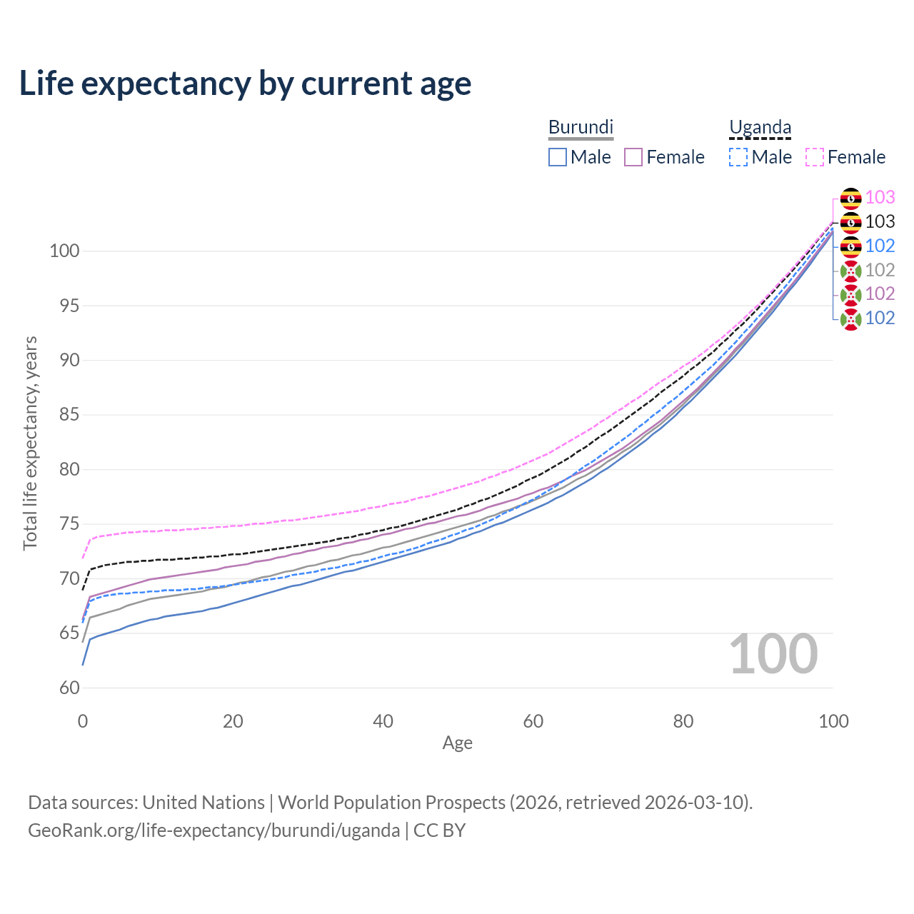 This life expectancy calculator shows the odds of living to 100, 95, 90, and below based on current age for both males and females in Burundi and Uganda, along with mean and median age of death. The calculations are based on the 2026 life tables (actuarial tables) from the UN World Population Prospects.