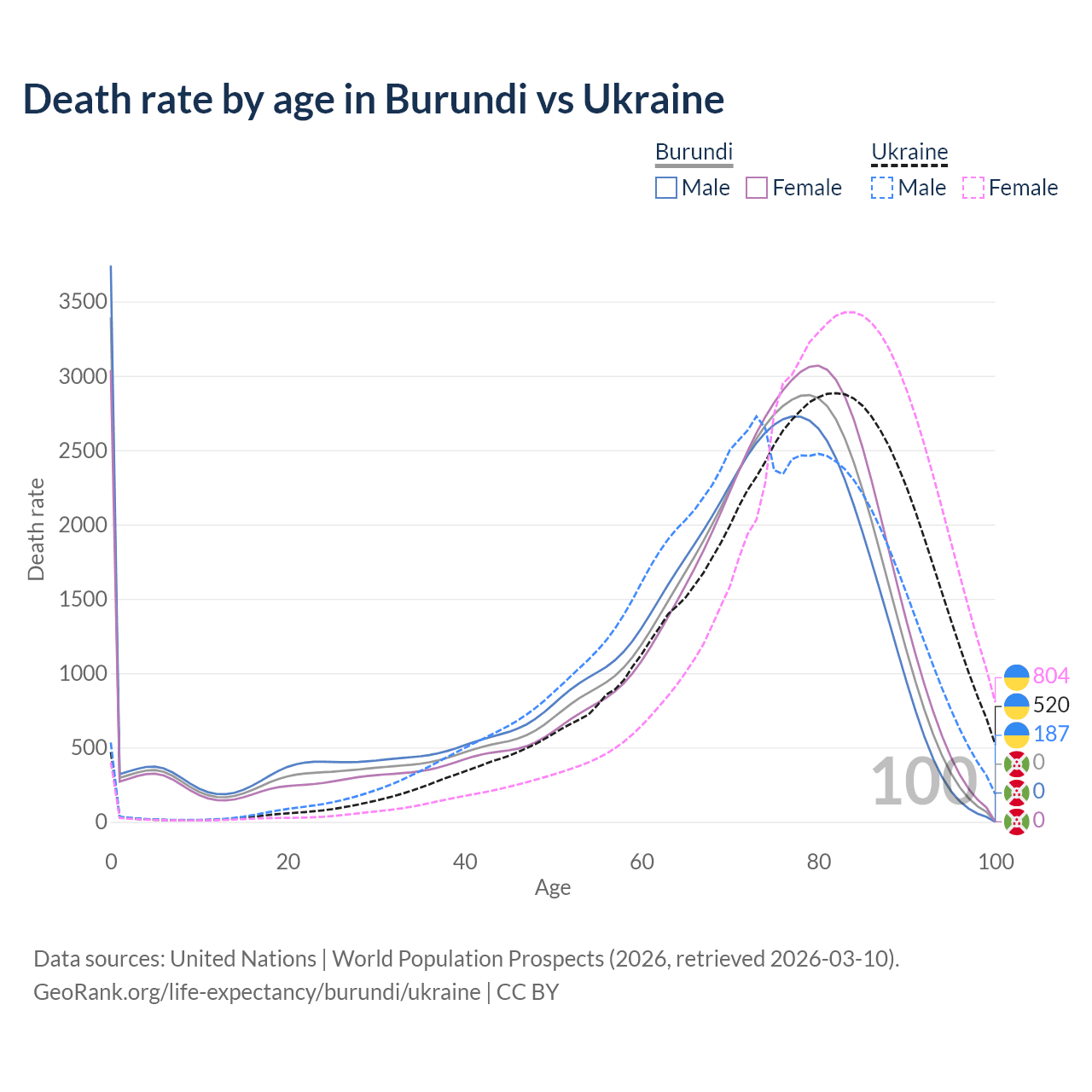 In Burundi, the most common age of death is 0, compared to 82 in Ukraine. The median age of death is 71.6 in Burundi and 78 in Ukraine, meaning only half of each cohort is expected to live past that age.