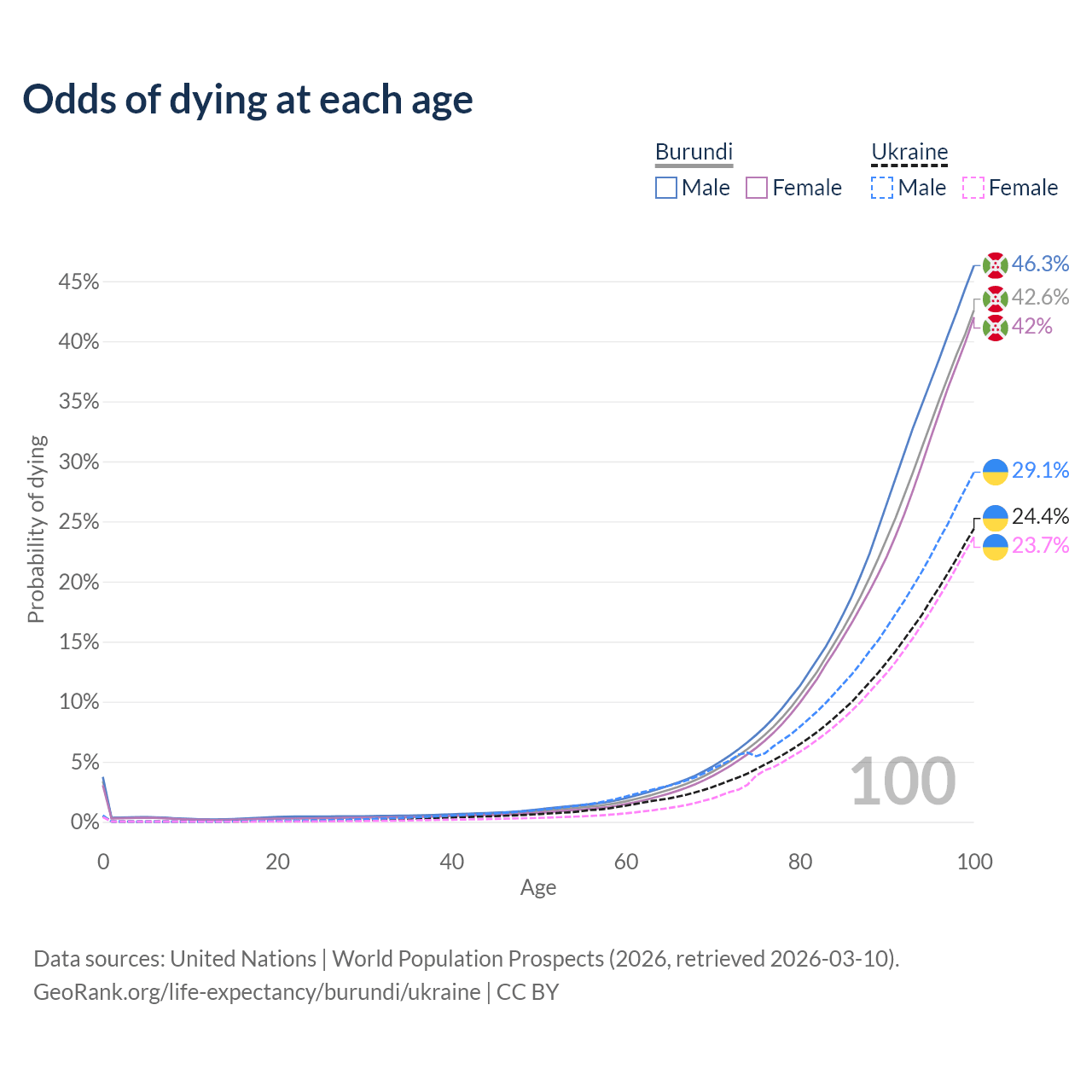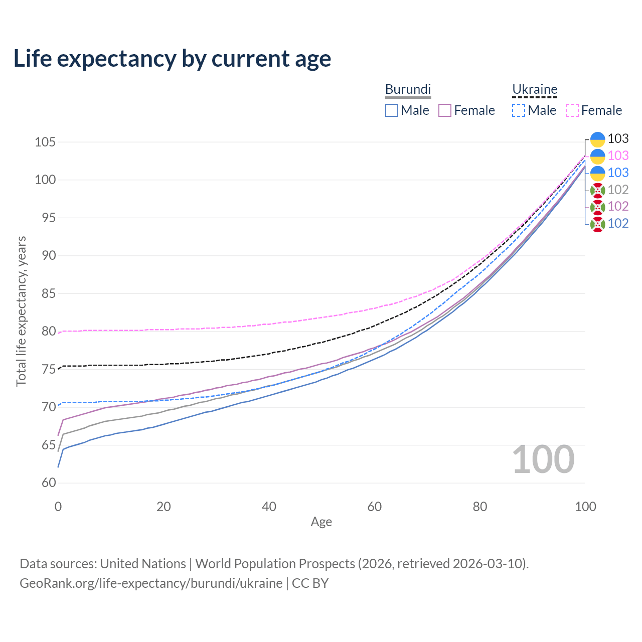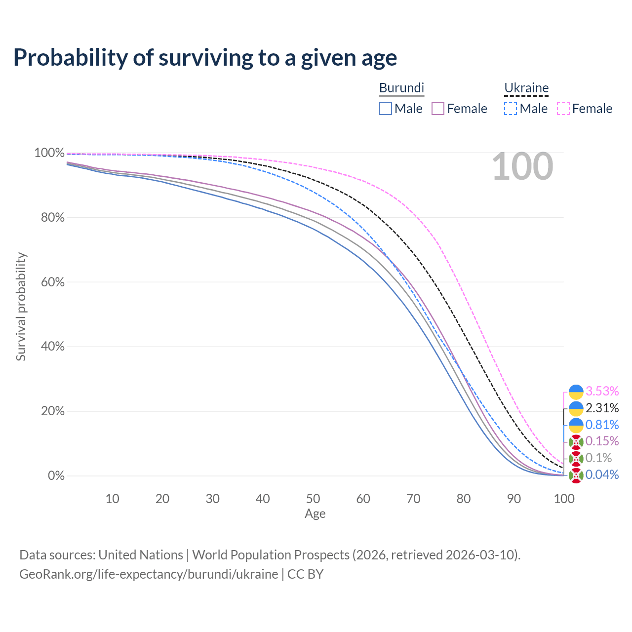 This life expectancy calculator shows the odds of living to 100, 95, 90, and below based on current age for both males and females in Burundi and Ukraine, along with mean and median age of death. The calculations are based on the 2026 life tables (actuarial tables) from the UN World Population Prospects.