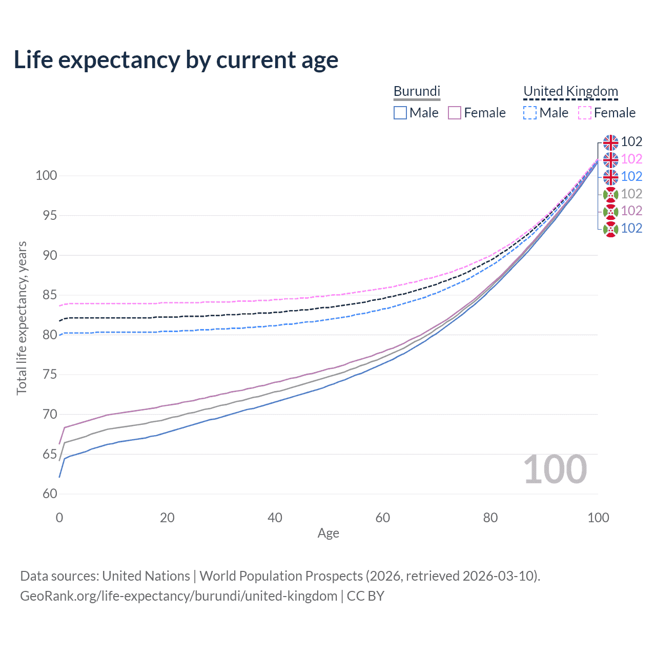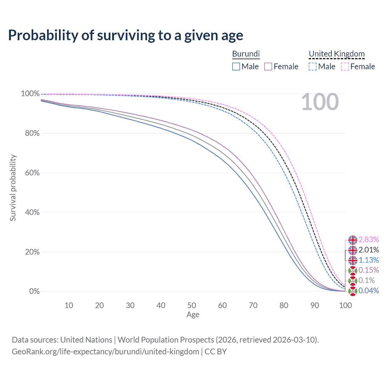 This life expectancy calculator shows the odds of living to 100, 95, 90, and below based on current age for both males and females in Burundi and the United Kingdom, along with mean and median age of death. The calculations are based on the 2026 life tables (actuarial tables) from the UN World Population Prospects.