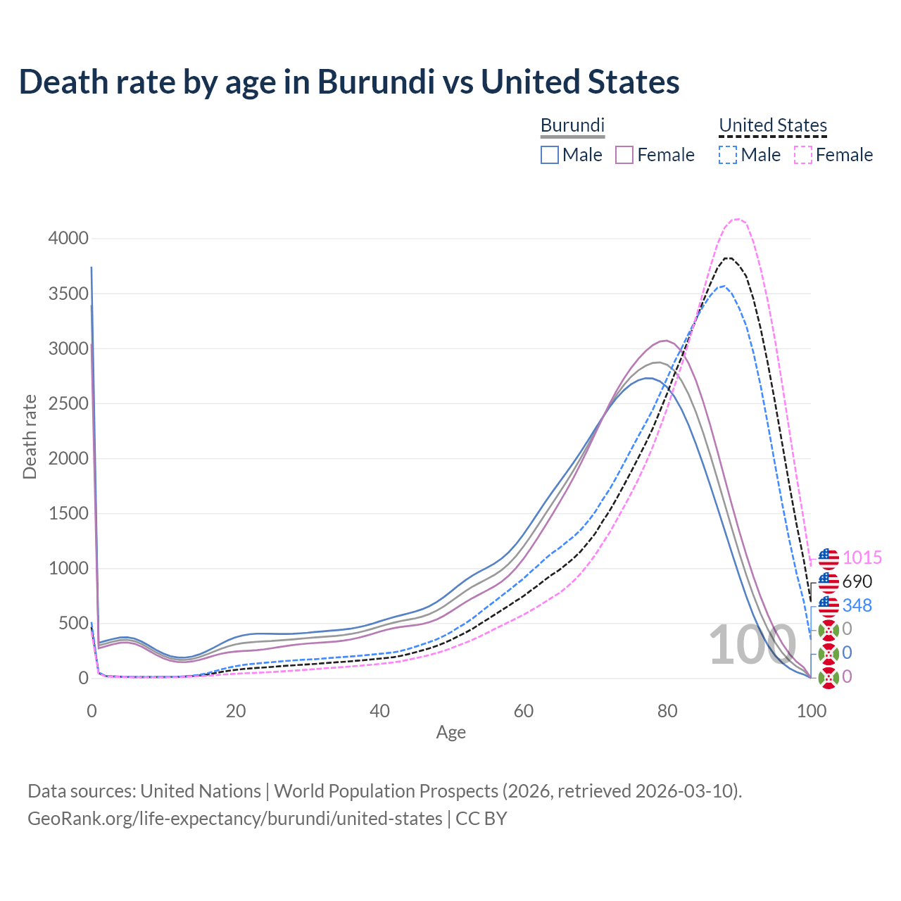 In Burundi, the most common age of death is 0, compared to 89 in the United States. The median age of death is 71.6 in Burundi and 83.9 in the United States, meaning only half of each cohort is expected to live past that age.
