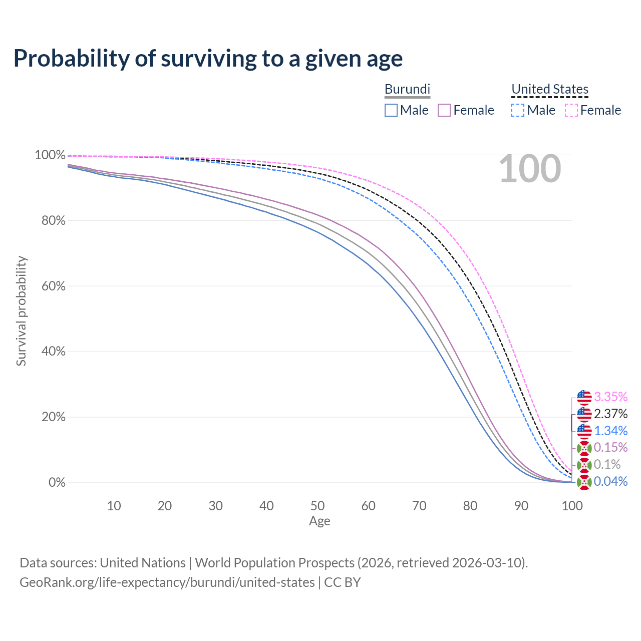 This life expectancy calculator shows the odds of living to 100, 95, 90, and below based on current age for both males and females in Burundi and the United States, along with mean and median age of death. The calculations are based on the 2026 life tables (actuarial tables) from the UN World Population Prospects.