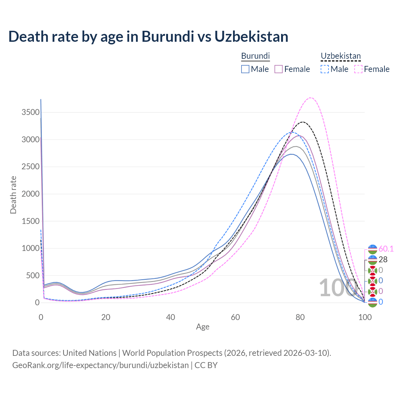 In Burundi, the most common age of death is 0, compared to 81 in Uzbekistan. The median age of death is 71.6 in Burundi and 76.4 in Uzbekistan, meaning only half of each cohort is expected to live past that age.