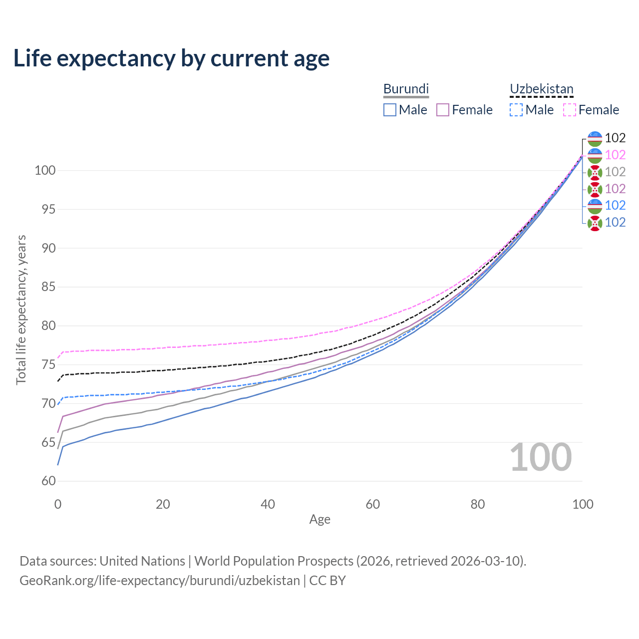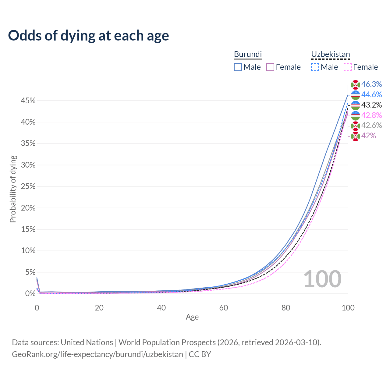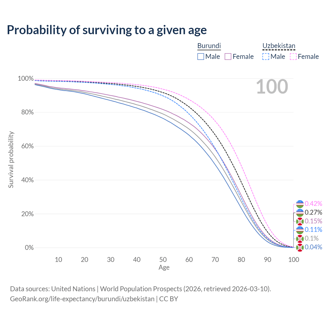 This life expectancy calculator shows the odds of living to 100, 95, 90, and below based on current age for both males and females in Burundi and Uzbekistan, along with mean and median age of death. The calculations are based on the 2026 life tables (actuarial tables) from the UN World Population Prospects.