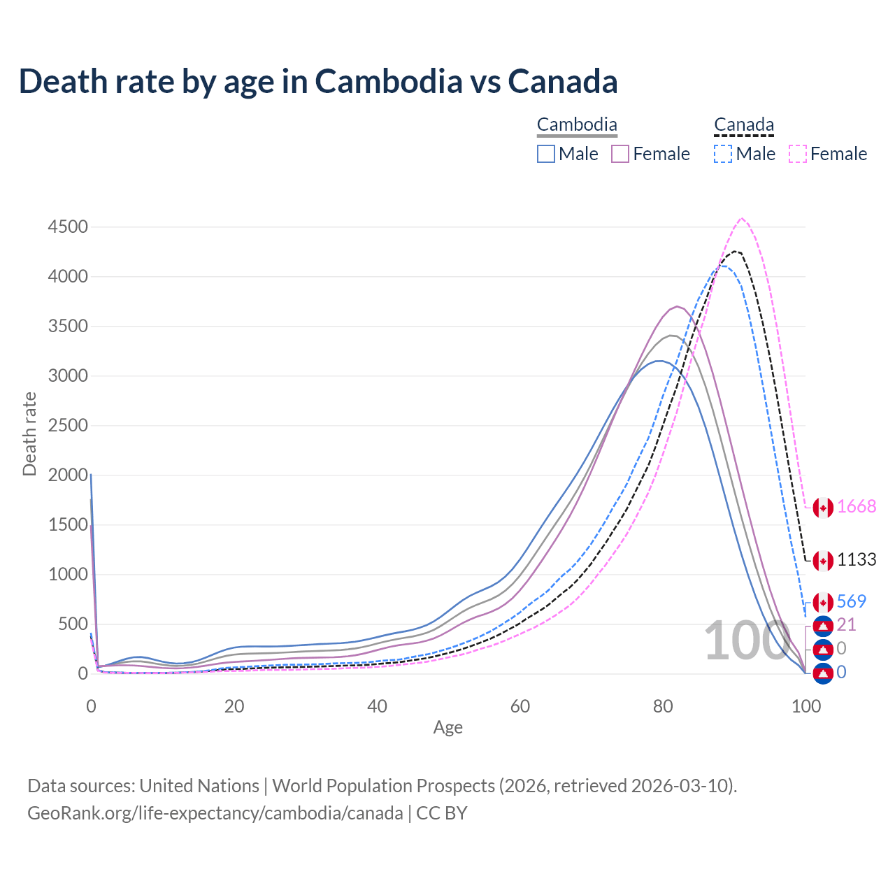 This life expectancy calculator shows the odds of living to 100, 95, 90, and below based on current age for both males and females in Cambodia and Canada, along with mean and median age of death. The calculations are based on the 2026 life tables (actuarial tables) from the UN World Population Prospects.