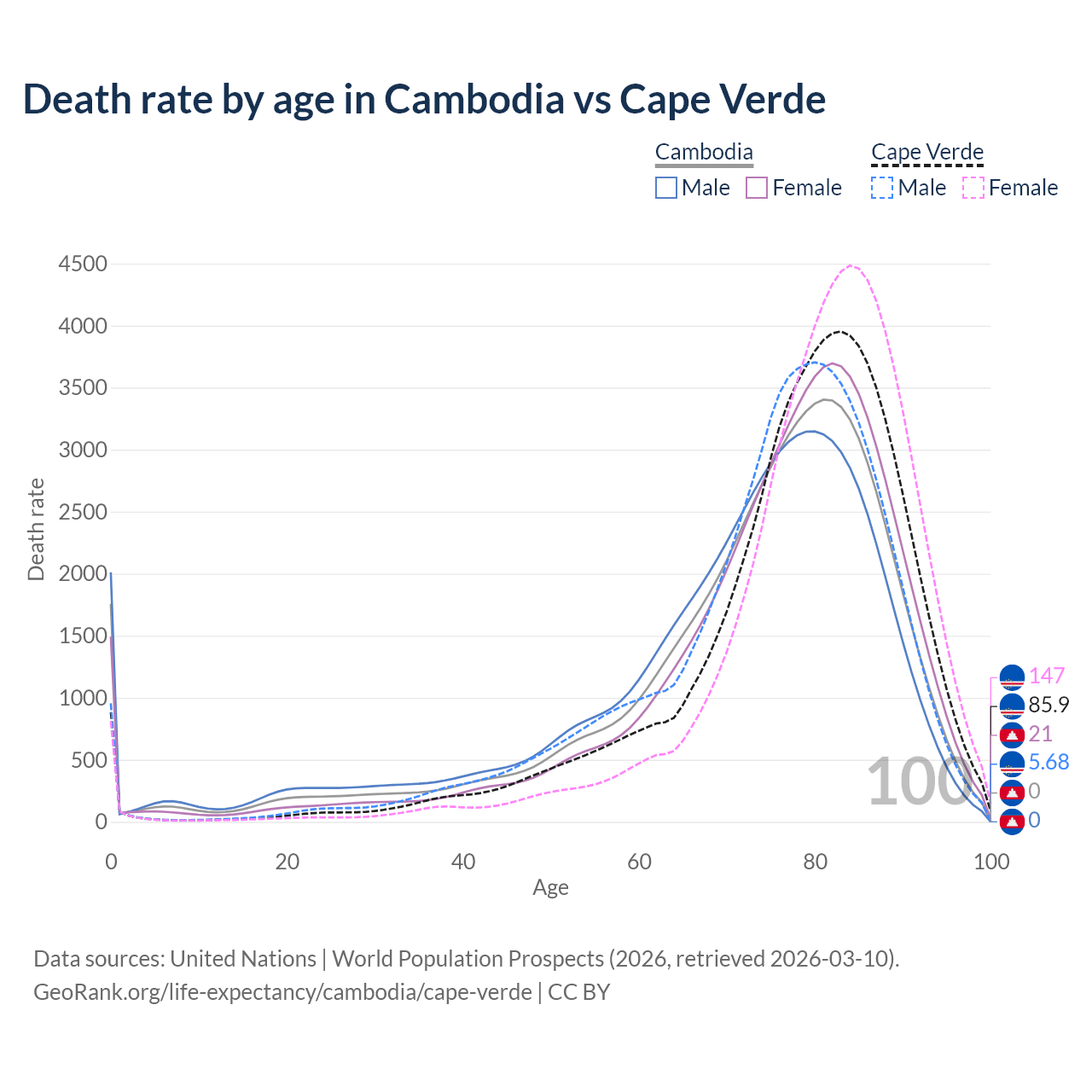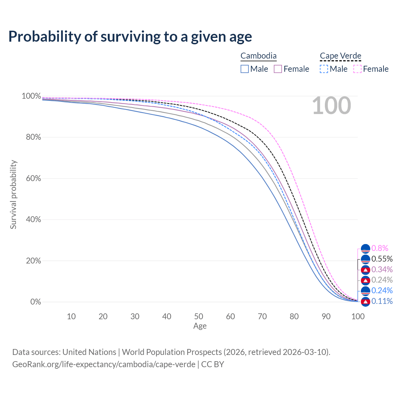 This life expectancy calculator shows the odds of living to 100, 95, 90, and below based on current age for both males and females in Cambodia and Cape Verde, along with mean and median age of death. The calculations are based on the 2026 life tables (actuarial tables) from the UN World Population Prospects.