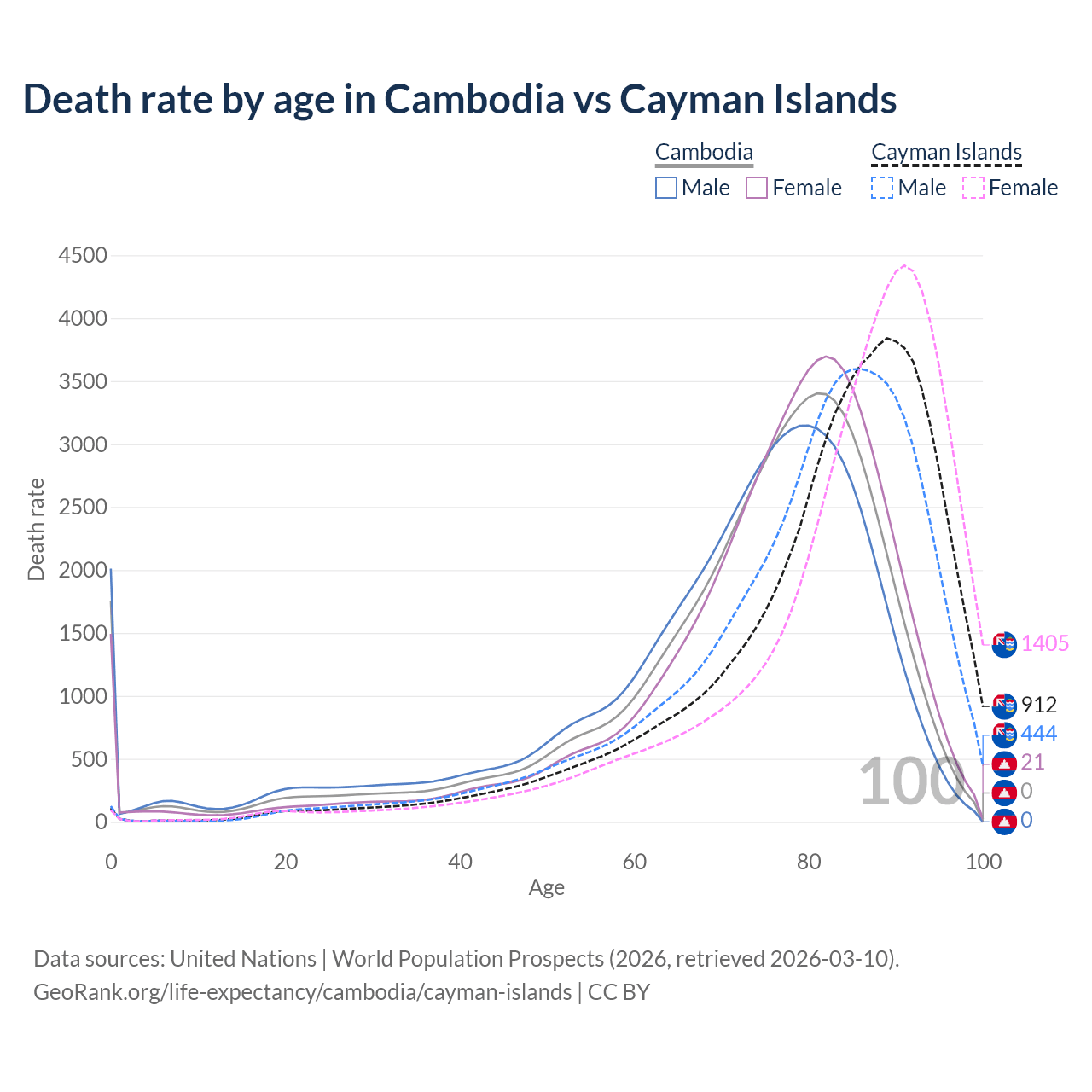 In Cambodia, the most common age of death is 81, compared to 89 in the Cayman Islands. The median age of death is 76.5 in Cambodia and 84.9 in the Cayman Islands, meaning only half of each cohort is expected to live past that age.