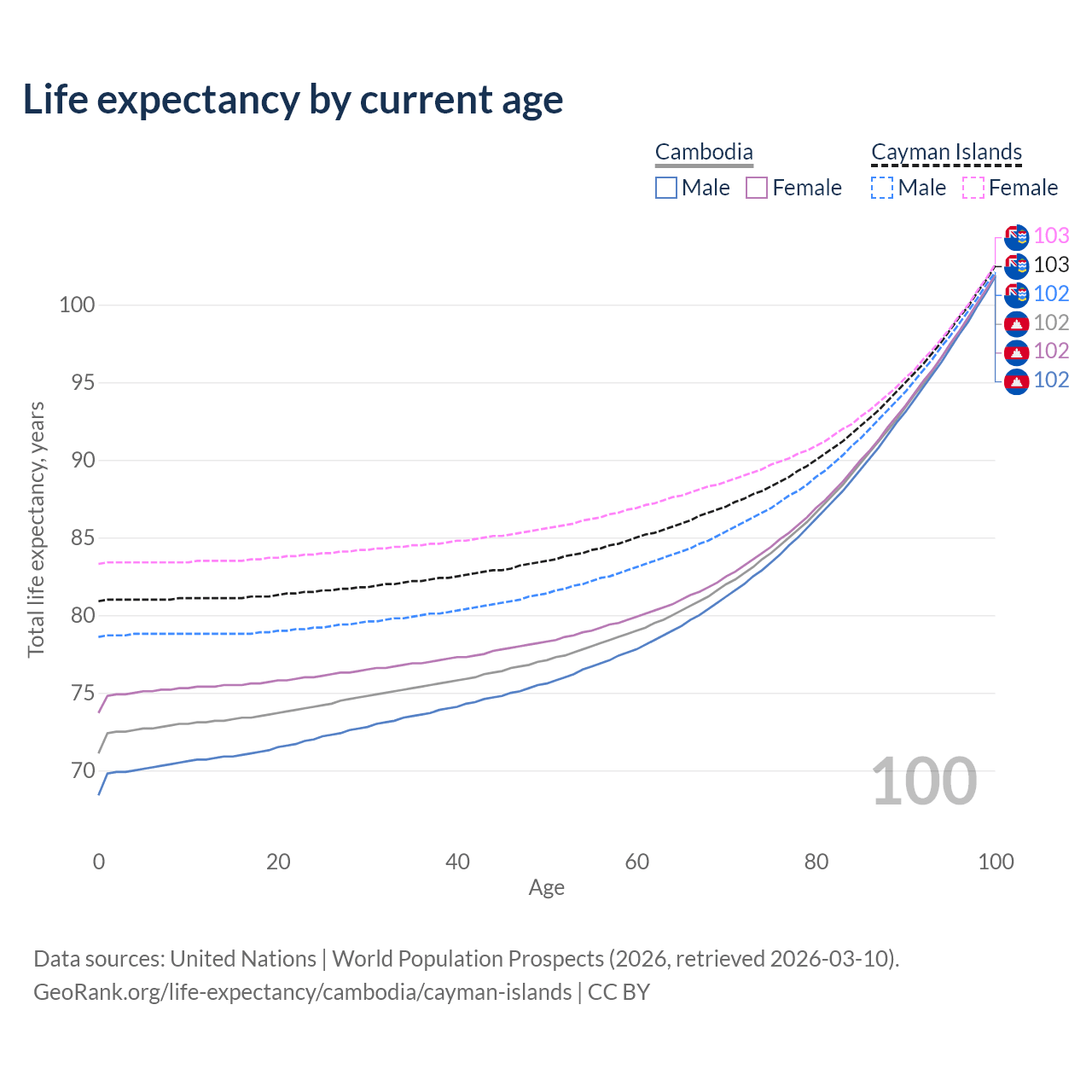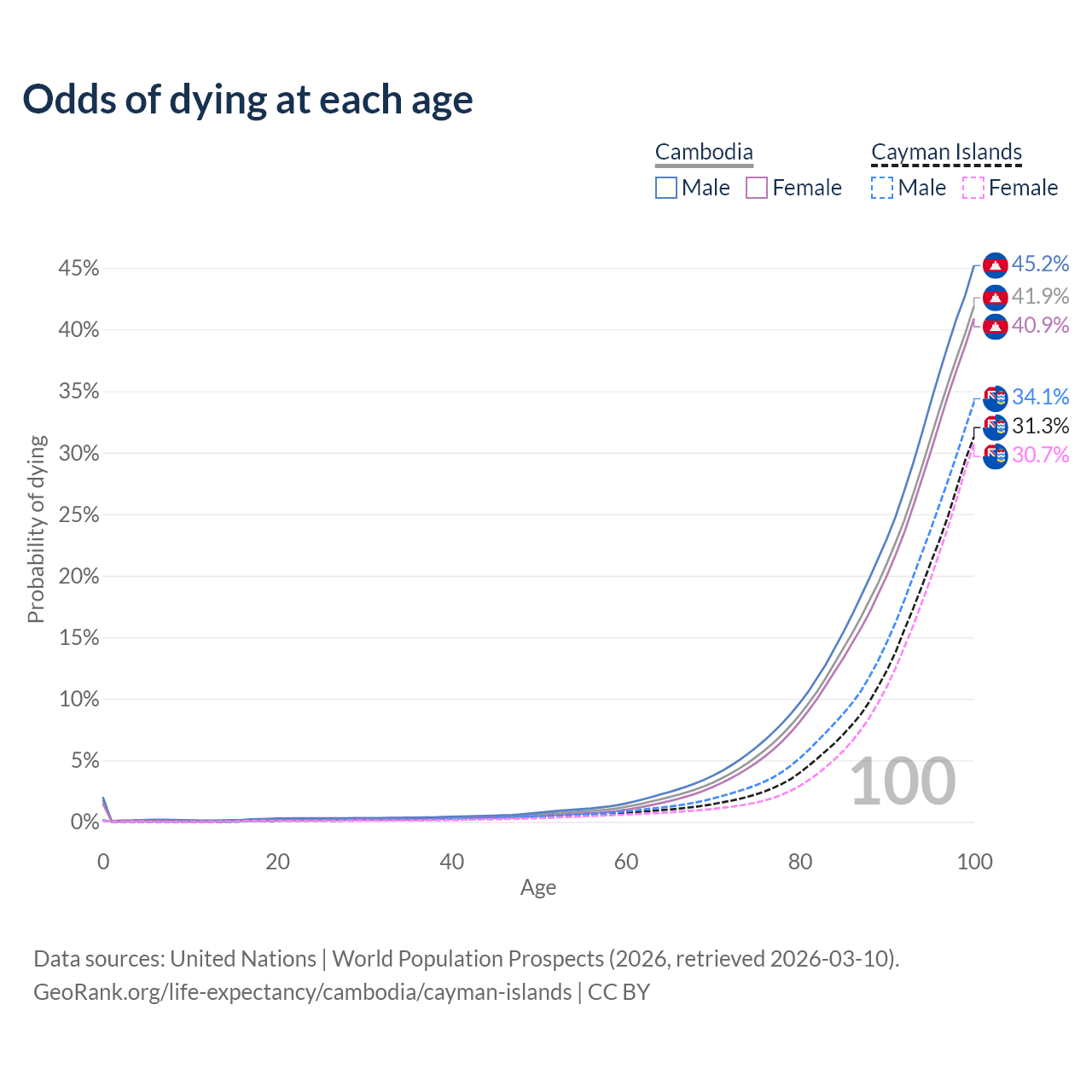 This life expectancy calculator shows the odds of living to 100, 95, 90, and below based on current age for both males and females in Cambodia and the Cayman Islands, along with mean and median age of death. The calculations are based on the 2026 life tables (actuarial tables) from the UN World Population Prospects.