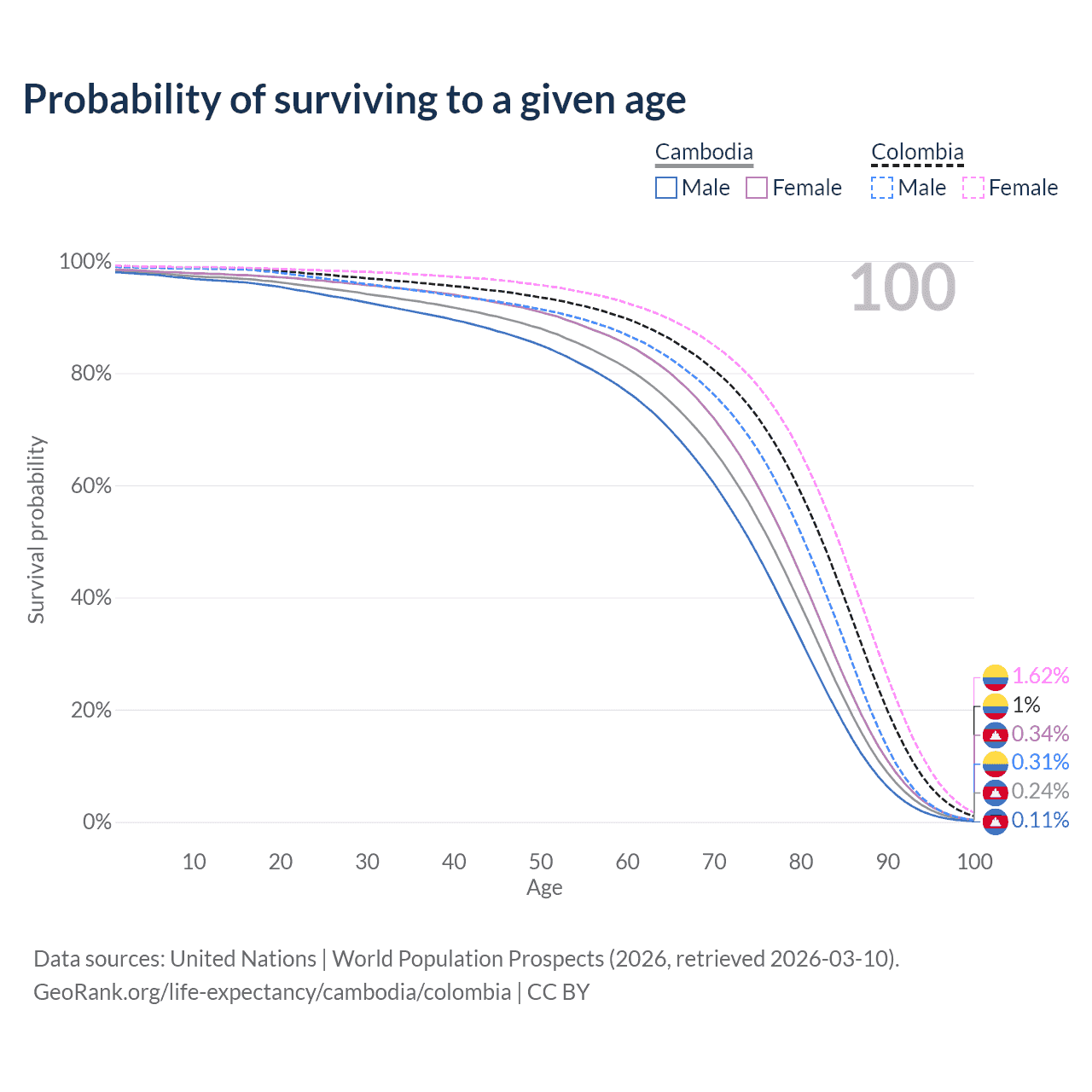 This life expectancy calculator shows the odds of living to 100, 95, 90, and below based on current age for both males and females in Cambodia and Colombia, along with mean and median age of death. The calculations are based on the 2026 life tables (actuarial tables) from the UN World Population Prospects.