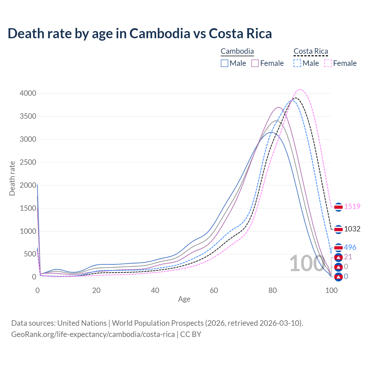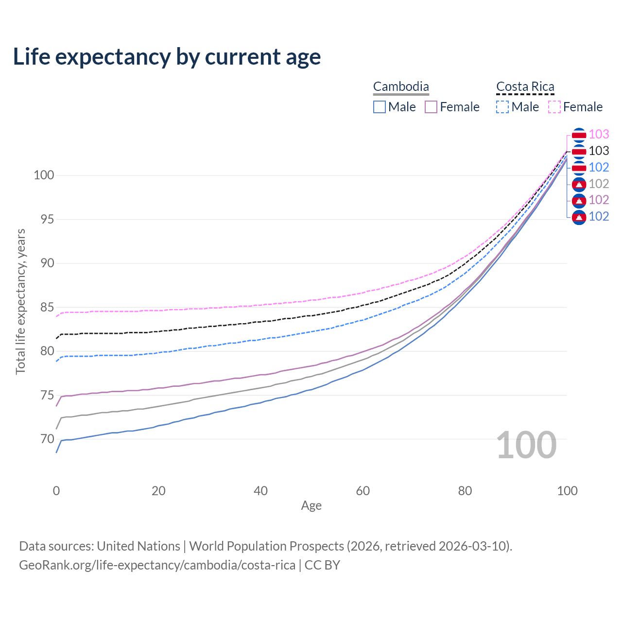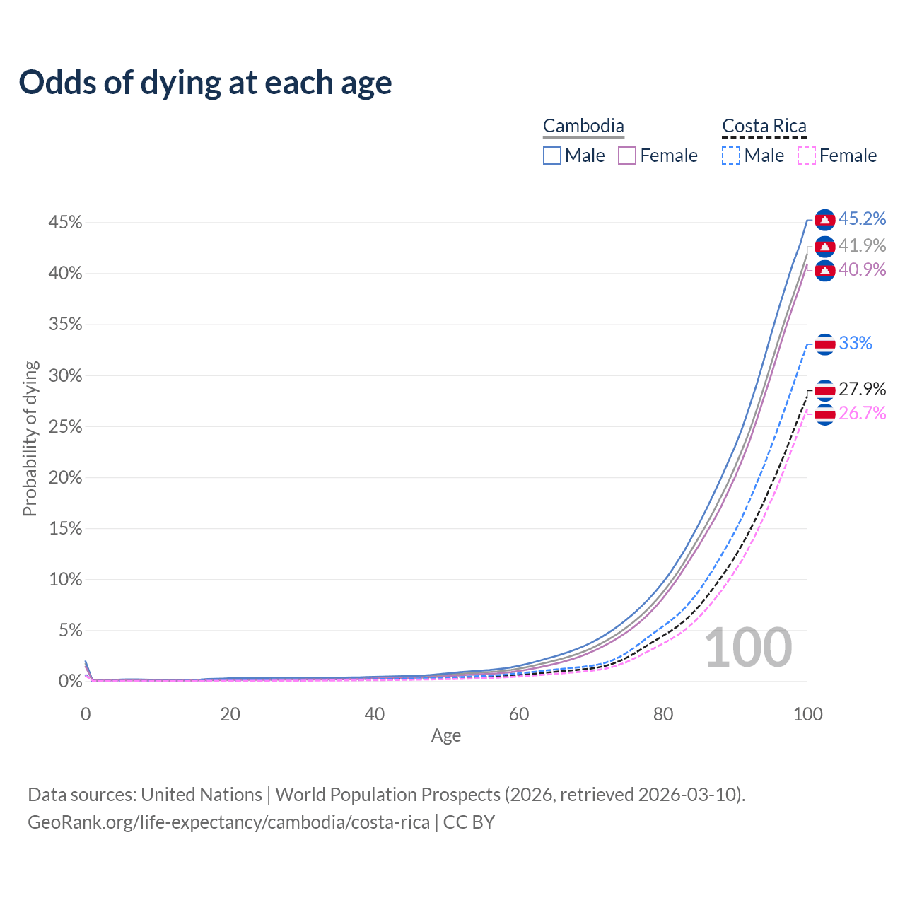 This life expectancy calculator shows the odds of living to 100, 95, 90, and below based on current age for both males and females in Cambodia and Costa Rica, along with mean and median age of death. The calculations are based on the 2026 life tables (actuarial tables) from the UN World Population Prospects.