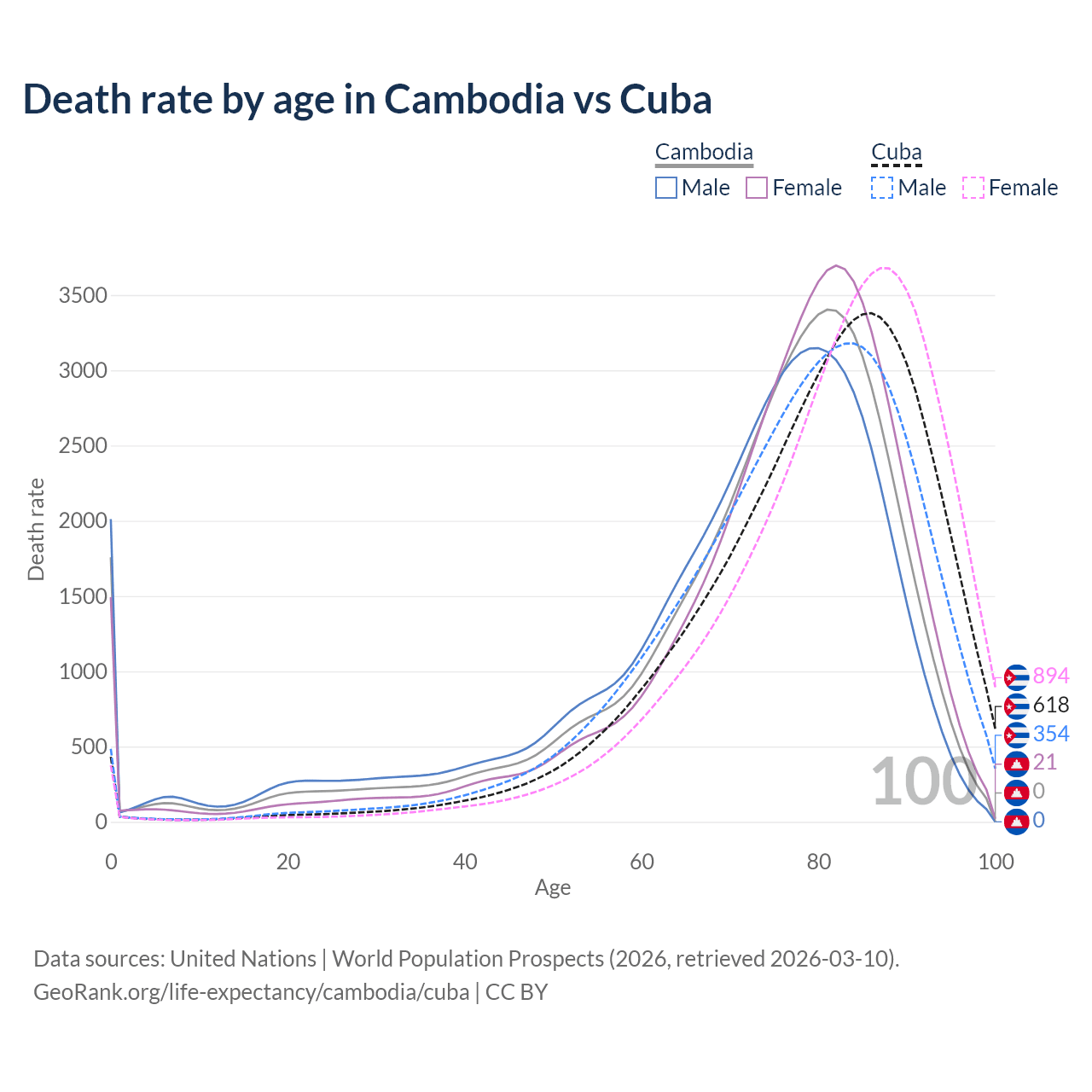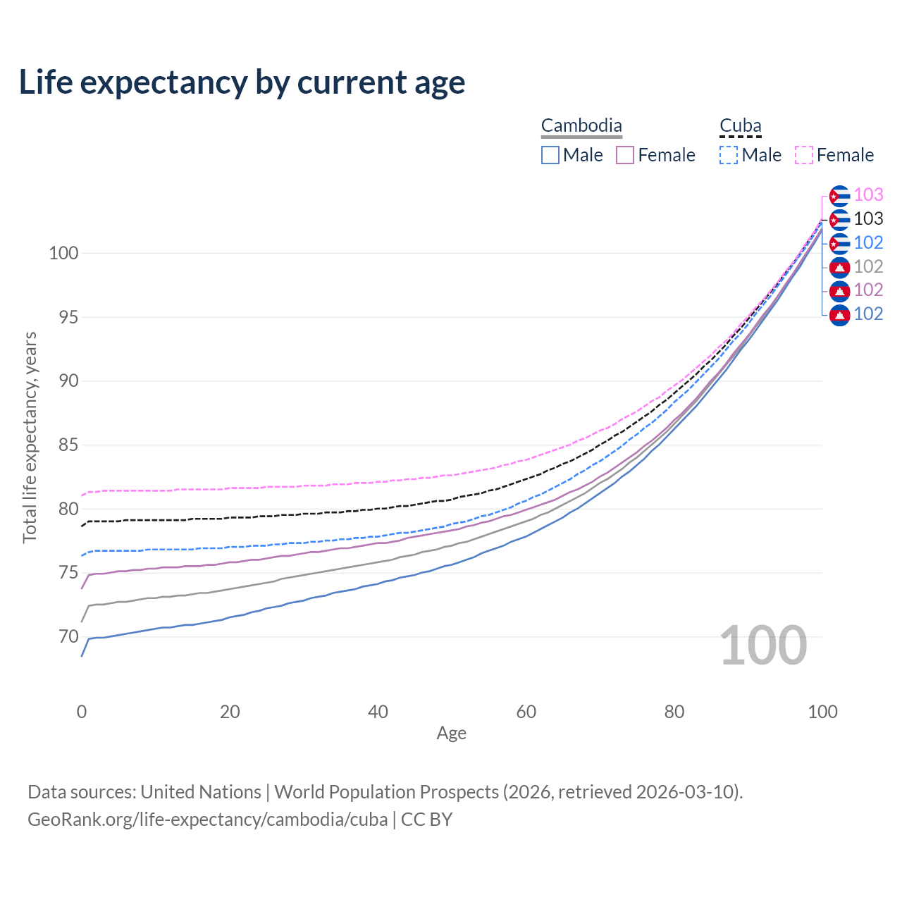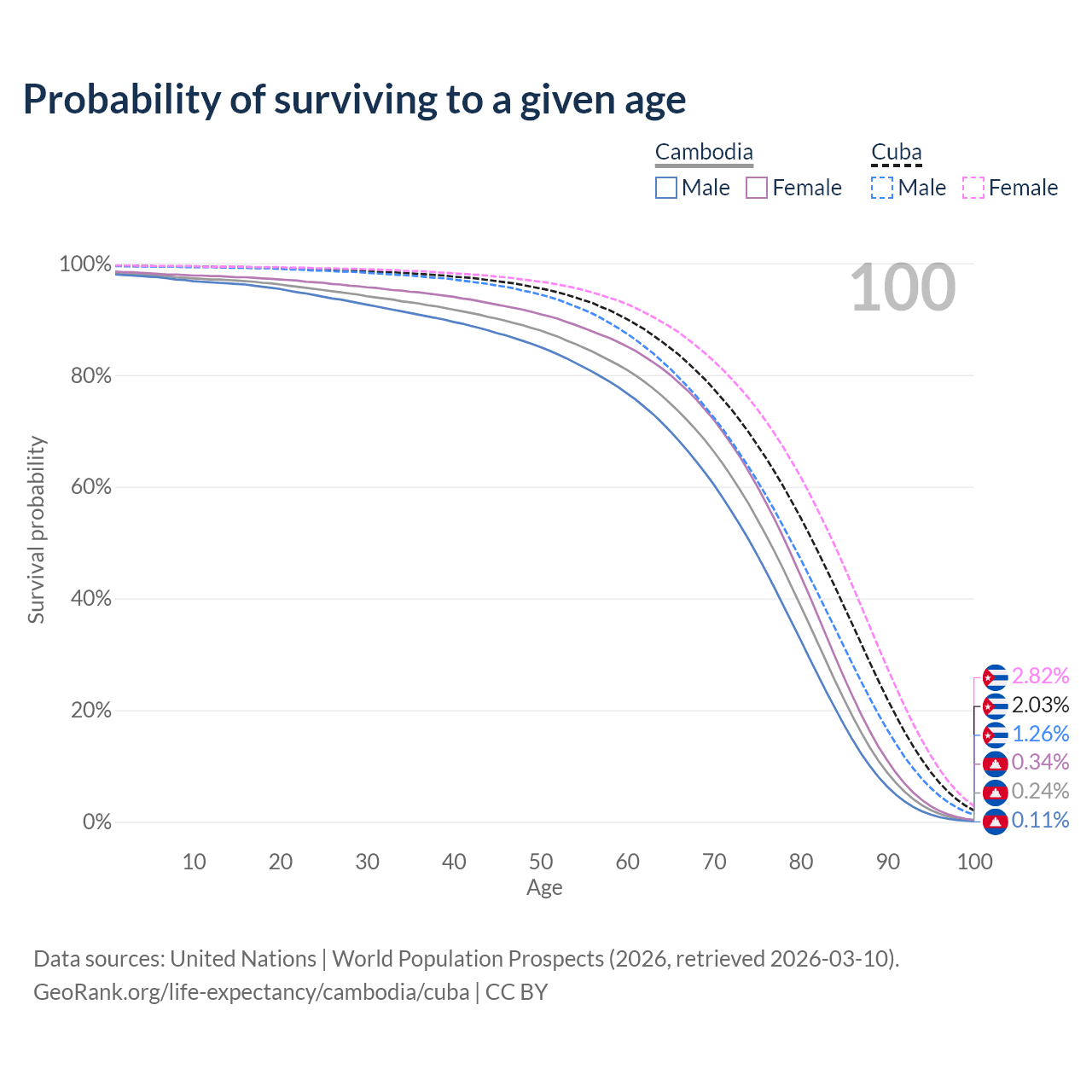 This life expectancy calculator shows the odds of living to 100, 95, 90, and below based on current age for both males and females in Cambodia and Cuba, along with mean and median age of death. The calculations are based on the 2026 life tables (actuarial tables) from the UN World Population Prospects.