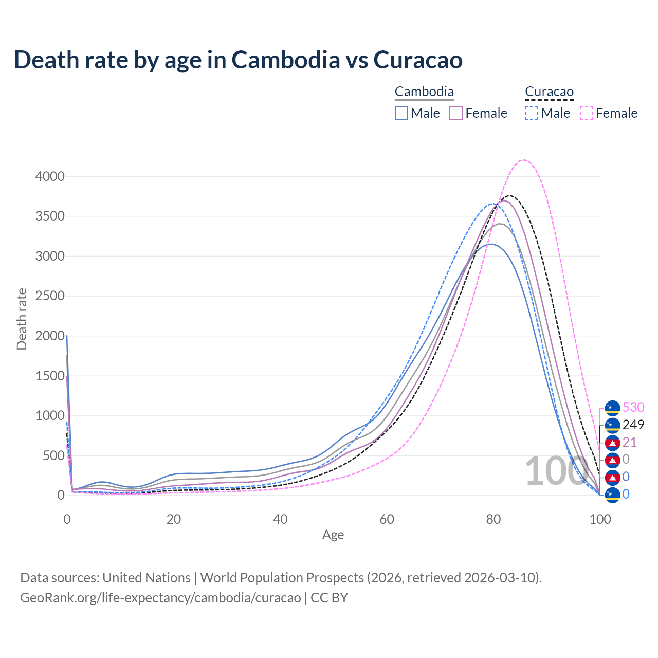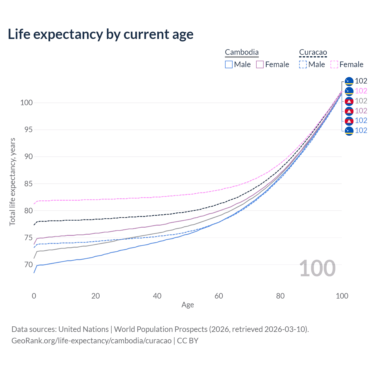 This life expectancy calculator shows the odds of living to 100, 95, 90, and below based on current age for both males and females in Cambodia and Curacao, along with mean and median age of death. The calculations are based on the 2026 life tables (actuarial tables) from the UN World Population Prospects.