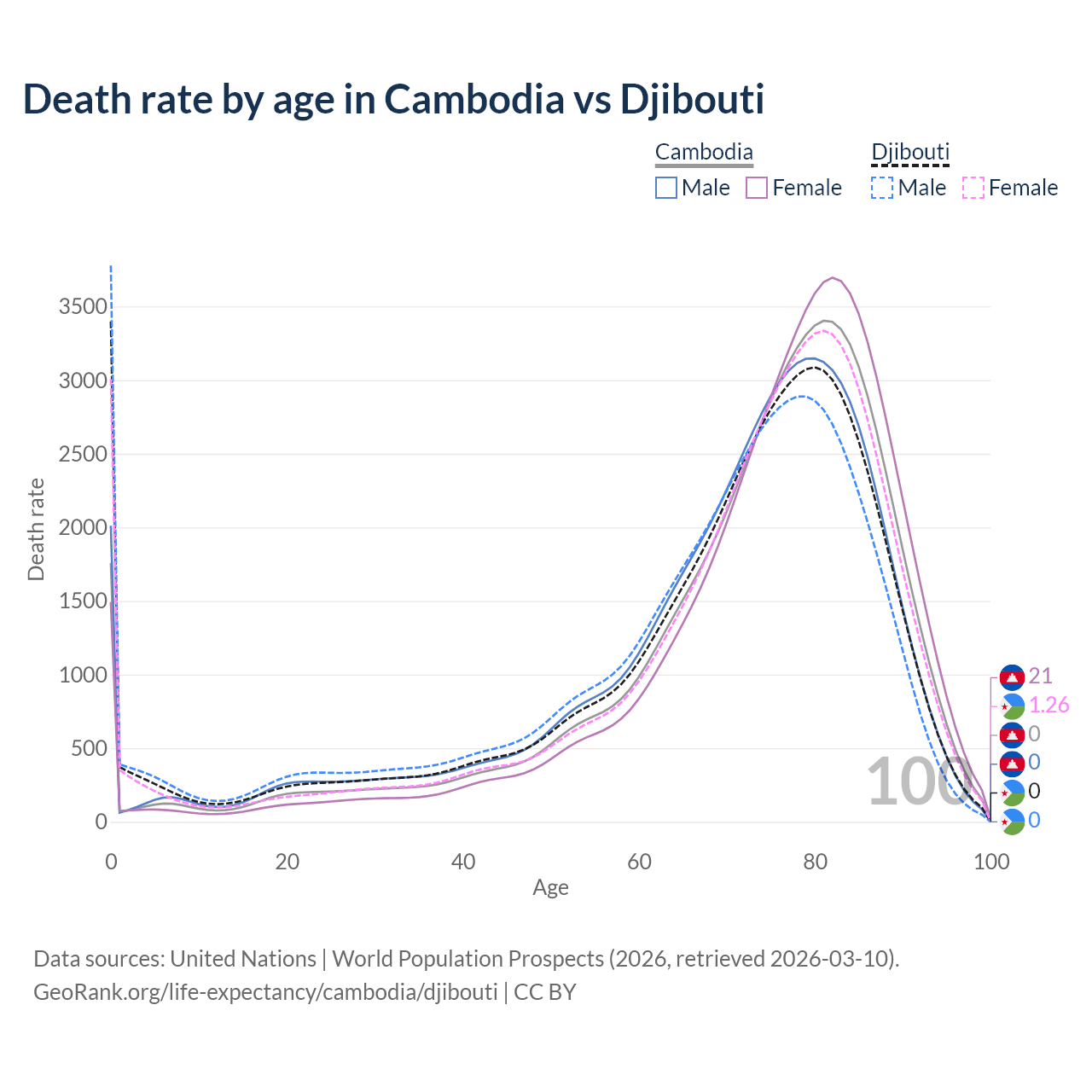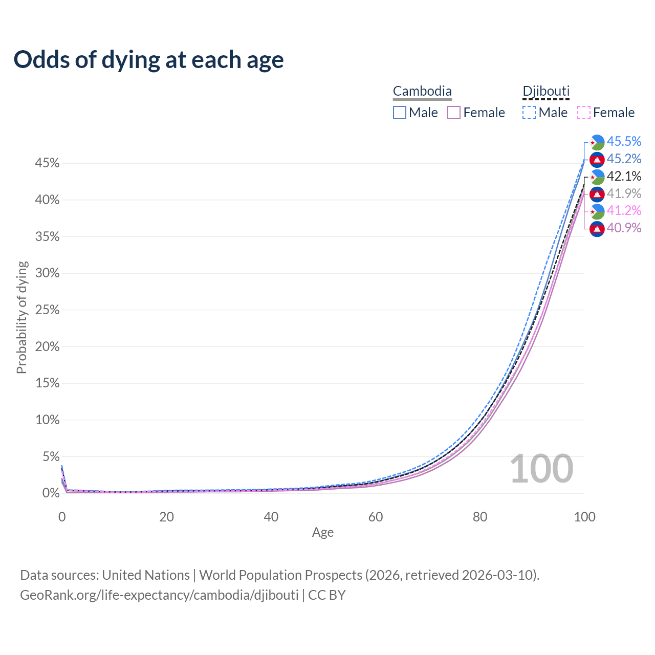 This life expectancy calculator shows the odds of living to 100, 95, 90, and below based on current age for both males and females in Cambodia and Djibouti, along with mean and median age of death. The calculations are based on the 2026 life tables (actuarial tables) from the UN World Population Prospects.