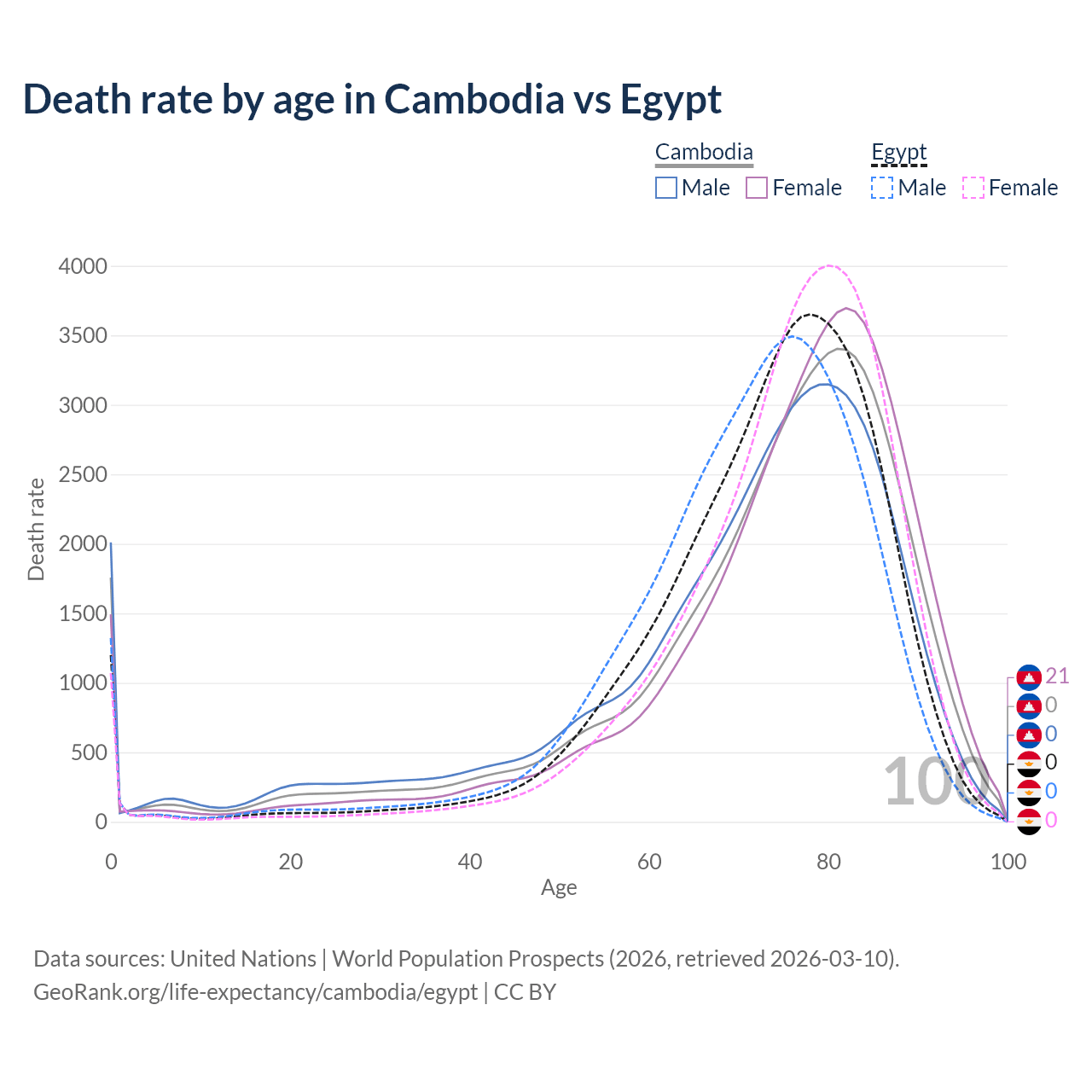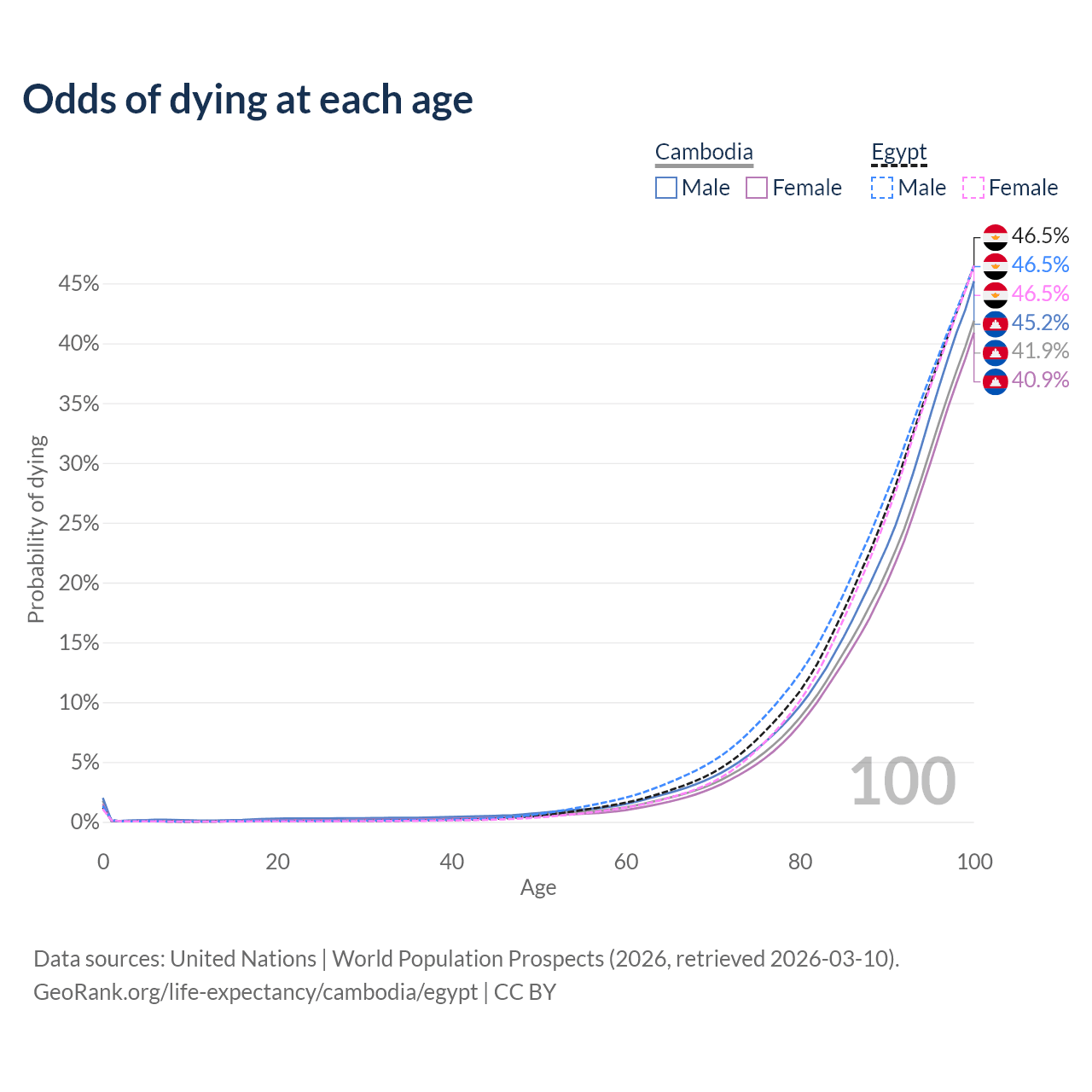 This life expectancy calculator shows the odds of living to 100, 95, 90, and below based on current age for both males and females in Cambodia and Egypt, along with mean and median age of death. The calculations are based on the 2026 life tables (actuarial tables) from the UN World Population Prospects.