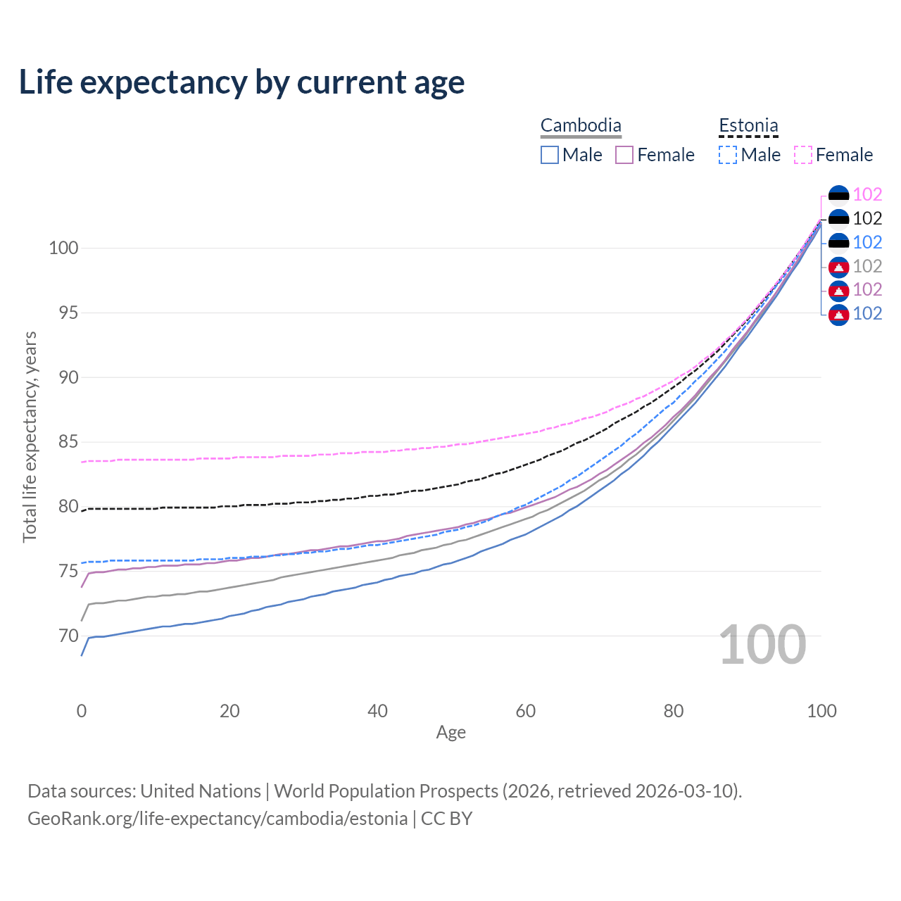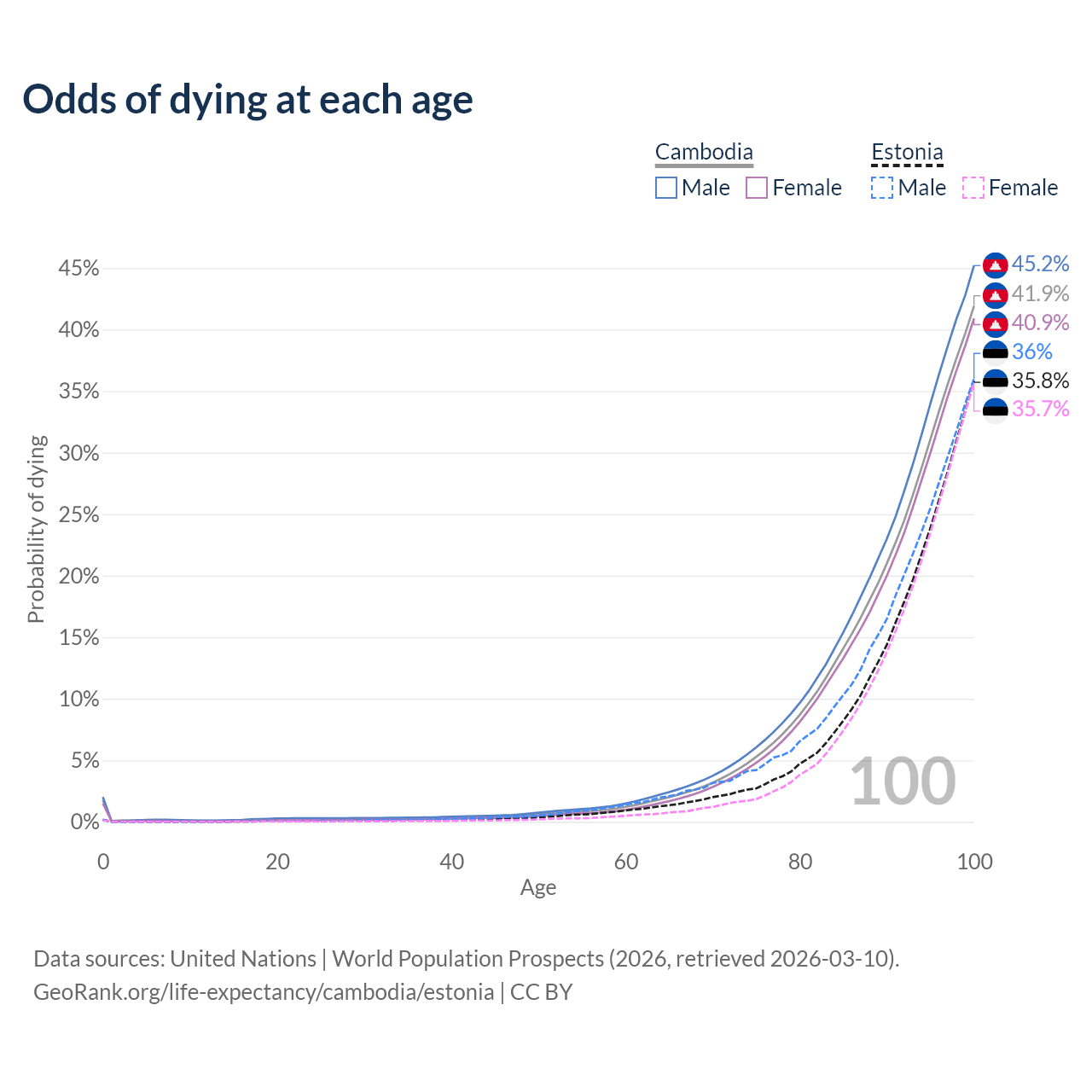 This life expectancy calculator shows the odds of living to 100, 95, 90, and below based on current age for both males and females in Cambodia and Estonia, along with mean and median age of death. The calculations are based on the 2026 life tables (actuarial tables) from the UN World Population Prospects.