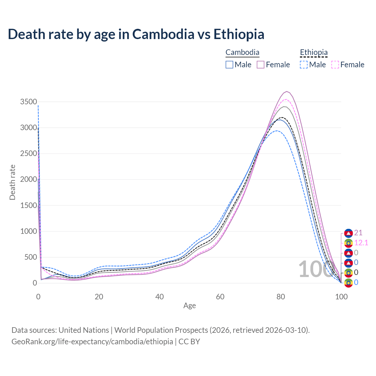 This life expectancy calculator shows the odds of living to 100, 95, 90, and below based on current age for both males and females in Cambodia and Ethiopia, along with mean and median age of death. The calculations are based on the 2026 life tables (actuarial tables) from the UN World Population Prospects.